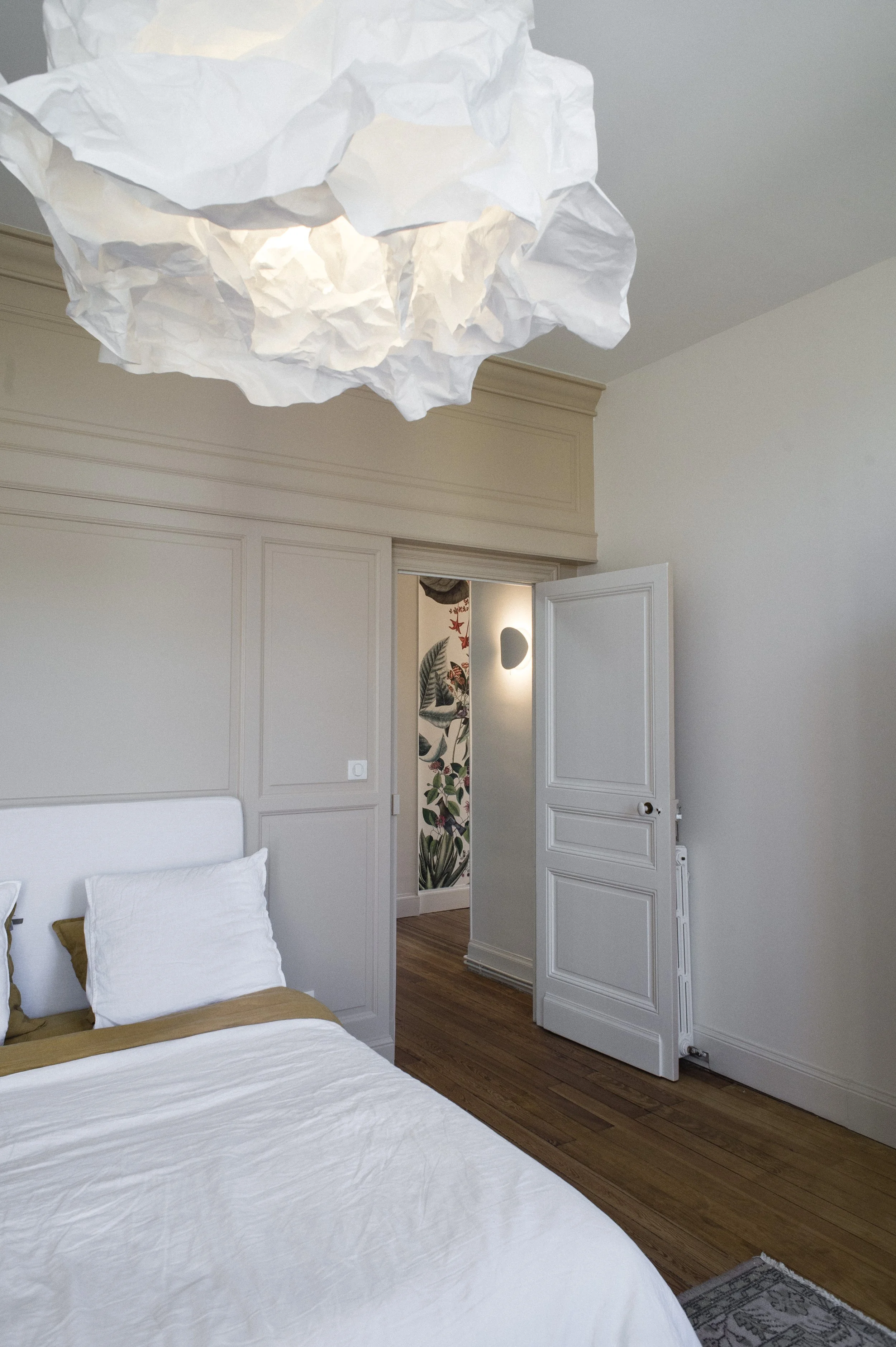La volonté a été de garder l’esprit et le charme de la maison. Les maitres d’ouvrages étant dans la restauration, un matériel professionnel de cuisine en inox tranche a été ajouté, avec un parquet point de Hongrie. Le choix des couleurs assez douces contrastent avec le noir. Les propriétaires, un jeune couple avec deux enfants, ont voulu modifier l’organisation et l’aménagement de la maison de manière à la mettre à leur gout. Un mur de refend a été déposé afin de créer un grand espace entre la cuisine et l’ancien bureau pour faire une pièce à vivre ; salle à manger/cuisine. Le dernier étage, anciennement des combles, a été aménagé pour créer l’espace enfants avec une grande pièce commune séparé par une grande verrière derrière laquelle l’espace se divise en deux chambres symétriques. Une salle d’eau au centre est accessible de chacune d’elles. Durée du chantier : trois mois.