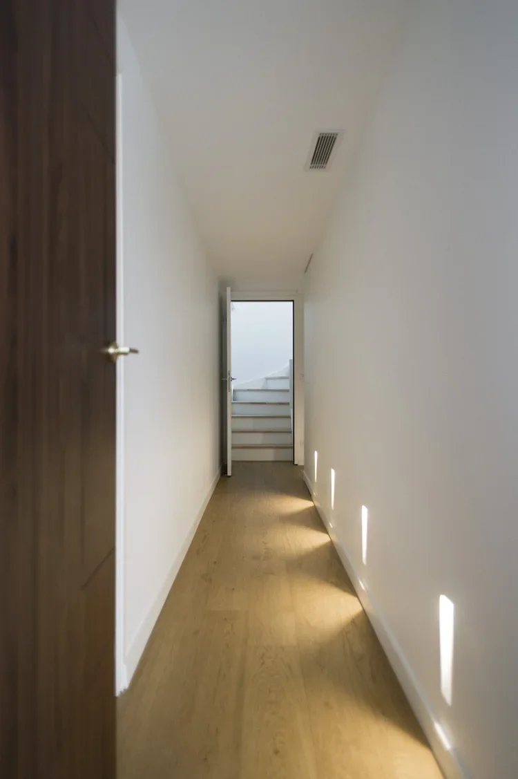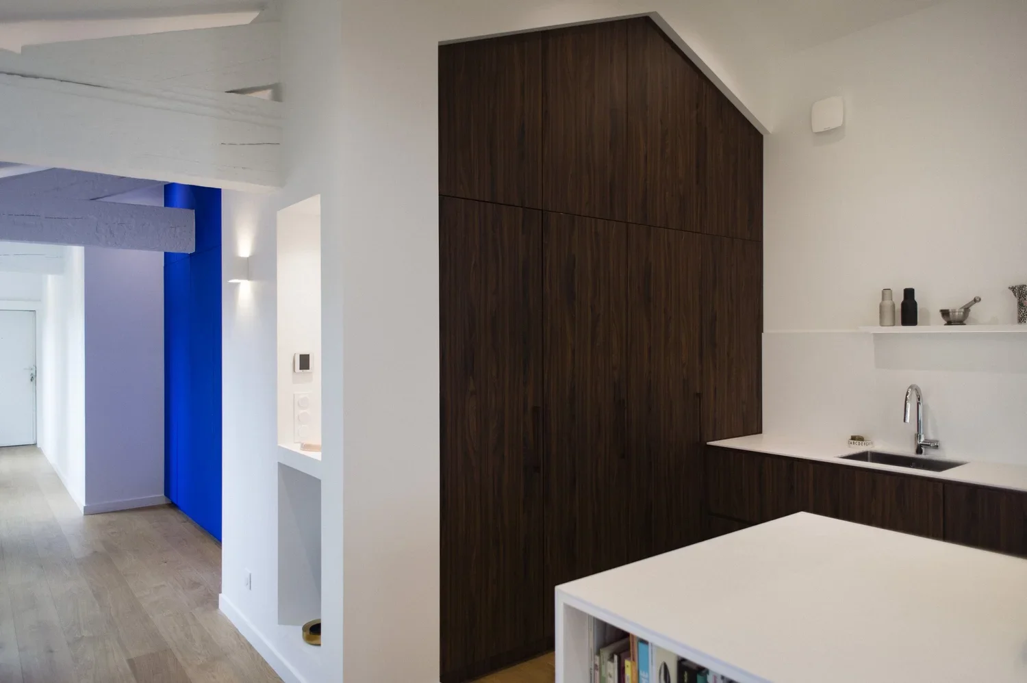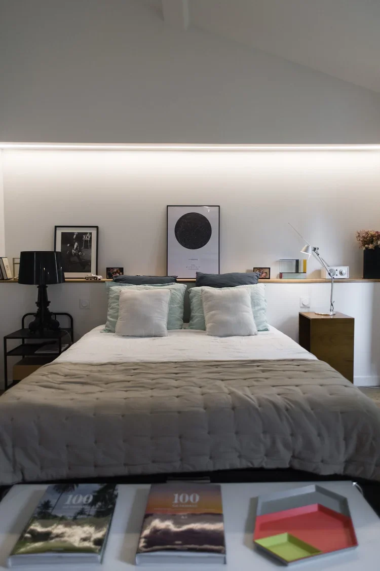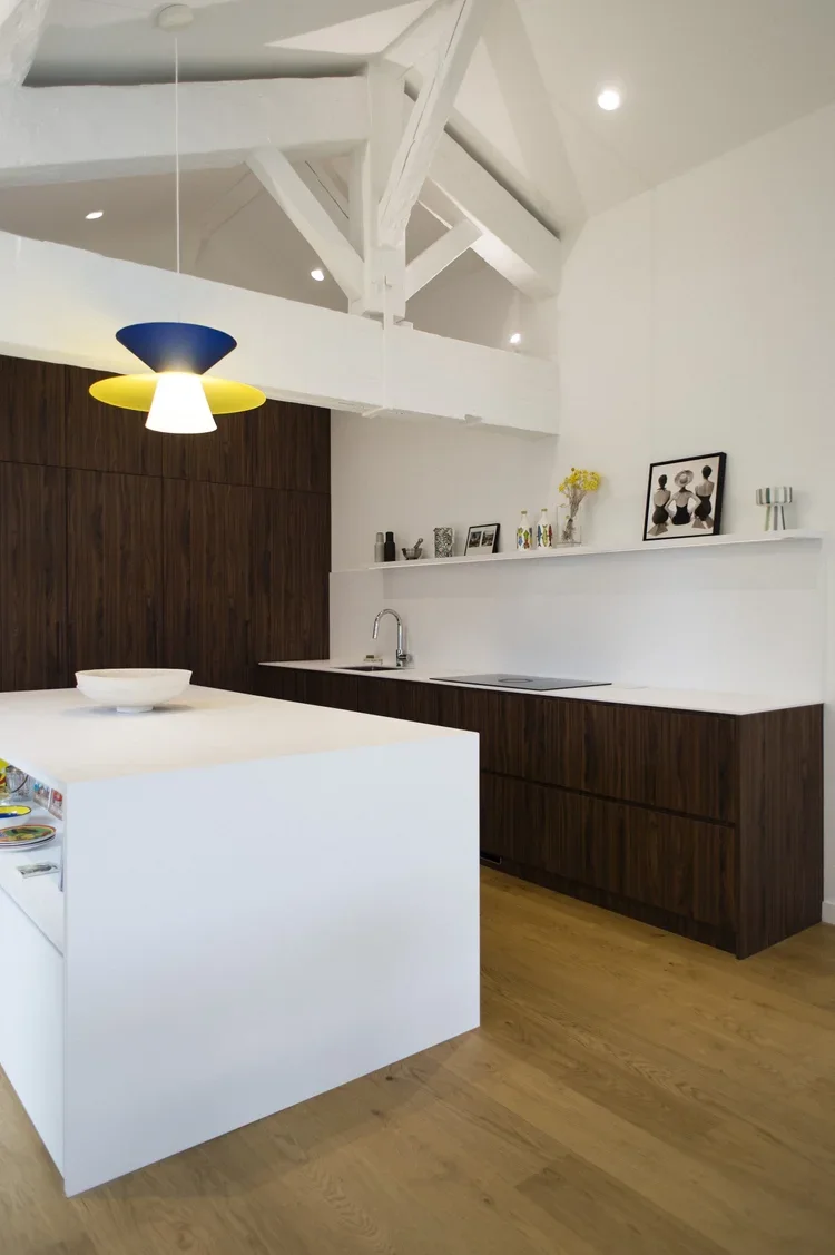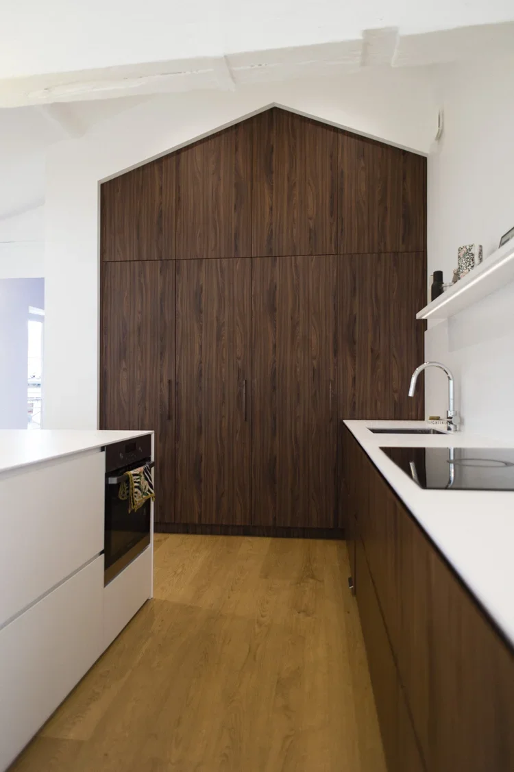Création d’une cuisine sur mesure s’alignant avec la charpente existante. Un mélange de bois et de blanc pour un rendu moderne et pratique. De nombreux rangements cachés derrière des portes sous tenture permettent un rendu minimaliste et linéaire. Des joints creux révèlent le design minutieux des portes apportant une plus-value esthétique et haut-de-gamme. La suite parentale combine deux topologies différentes : la chambre, claire et sous poutres, fusionne avec la salle de bain de couleur profonde et au plafond bas pour apporter une ambiance intimiste.