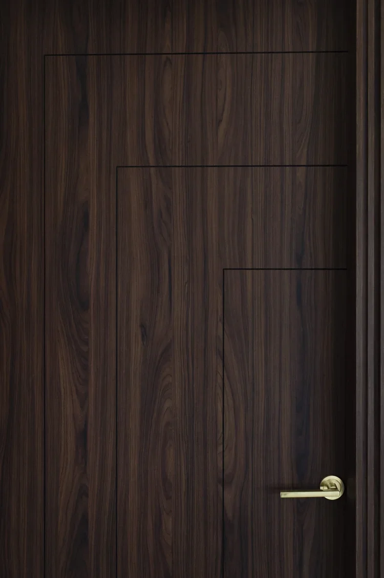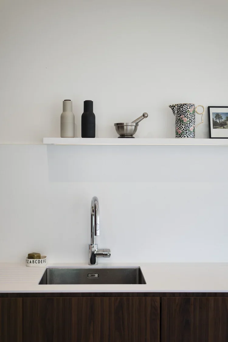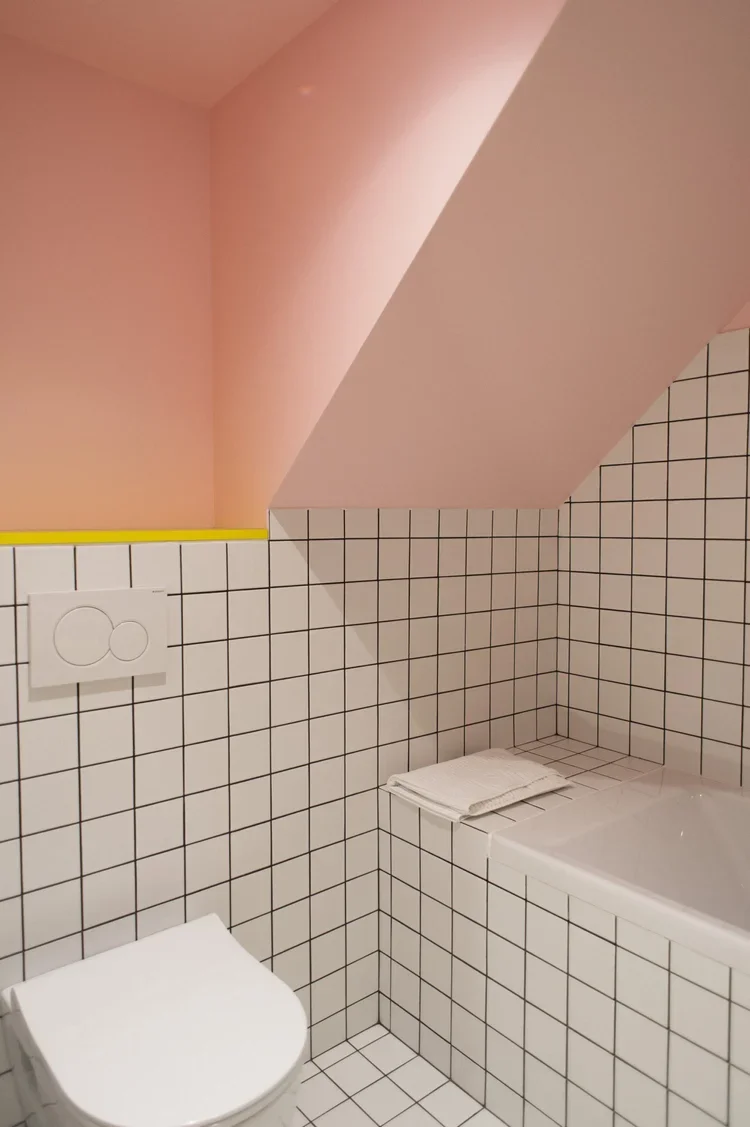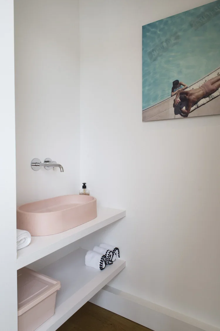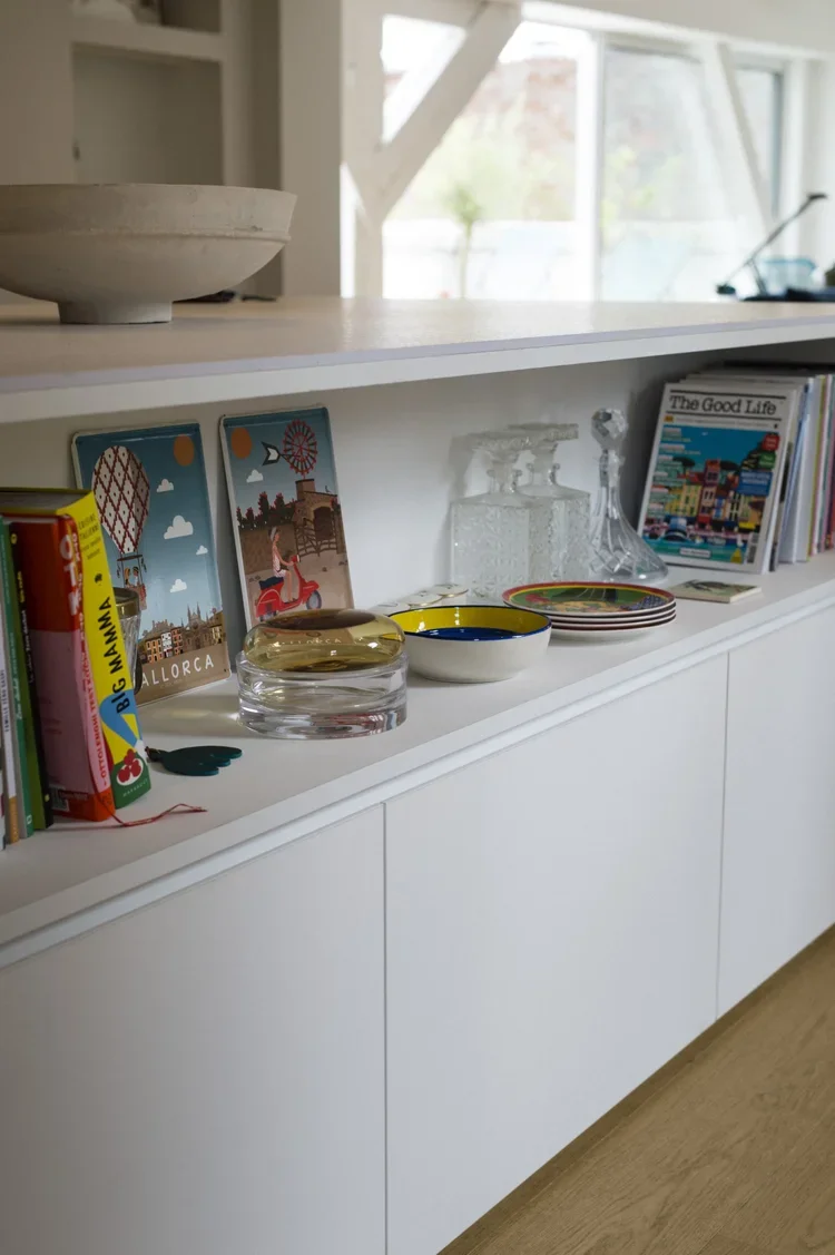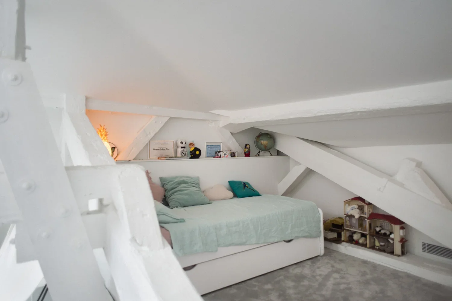 Création d’une cuisine sur mesure s’alignant avec la charpente existante. Un mélange de bois et de blanc pour un rendu moderne et pratique. De nombreux rangements cachés derrière des portes sous tenture permettent un rendu minimaliste et linéaire. Des joints creux révèlent le design minutieux des portes apportant une plus-value esthétique et haut-de-gamme. La suite parentale combine deux topologies différentes : la chambre, claire et sous poutres, fusionne avec la salle de bain de couleur profonde et au plafond bas pour apporter une ambiance intimiste.