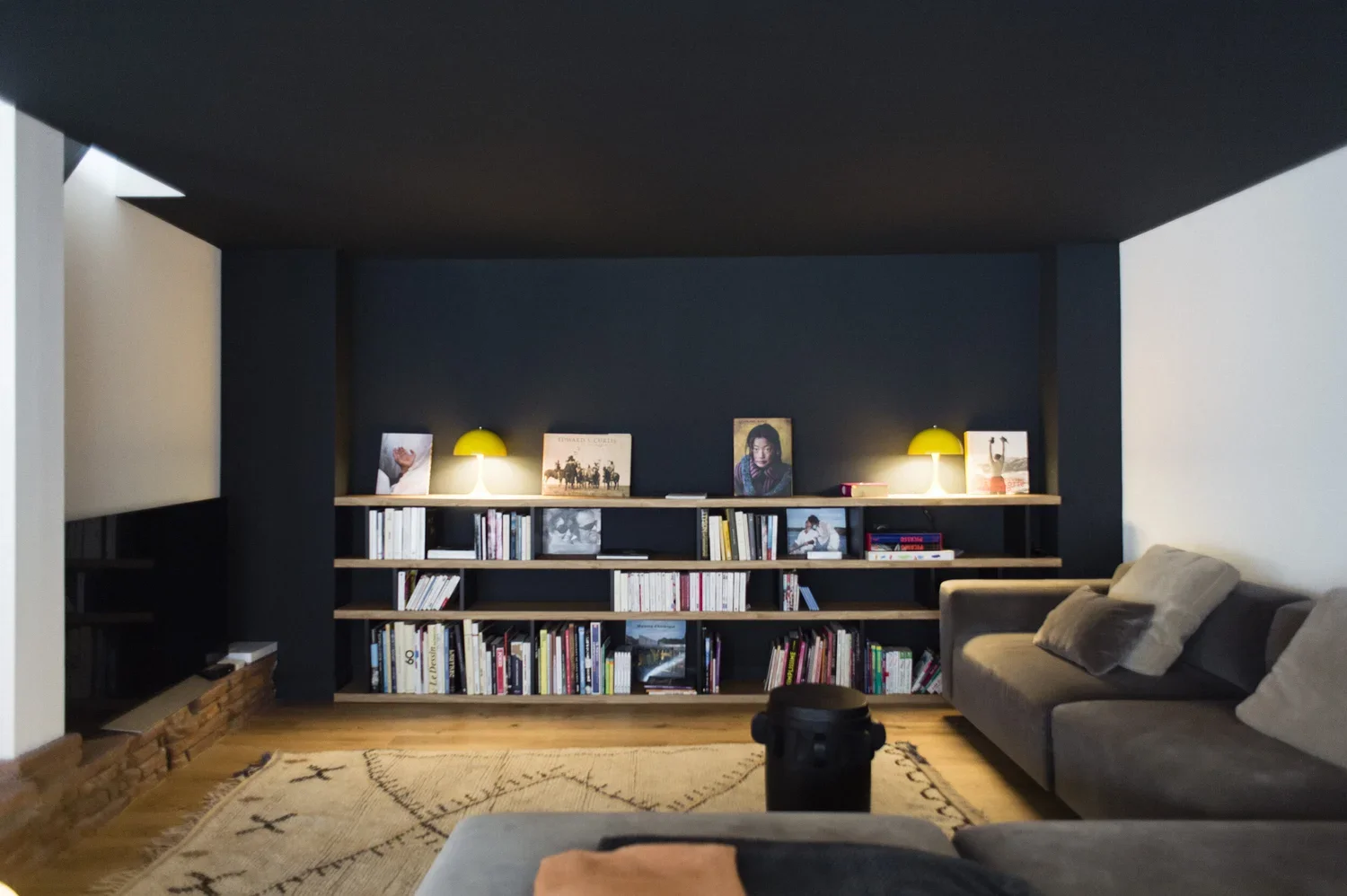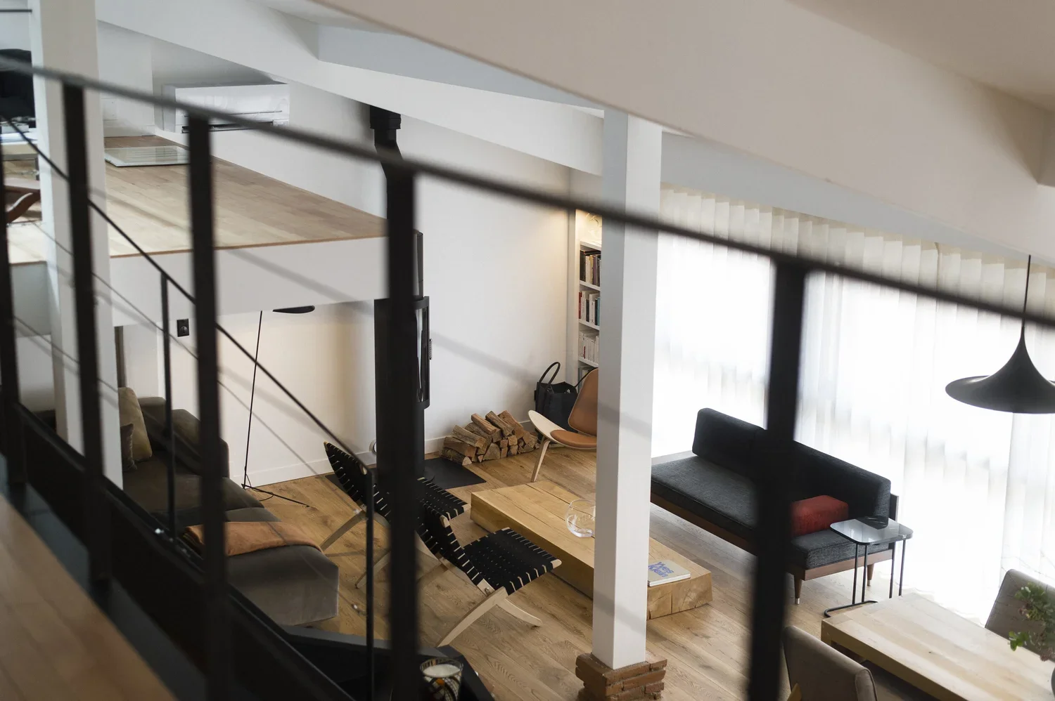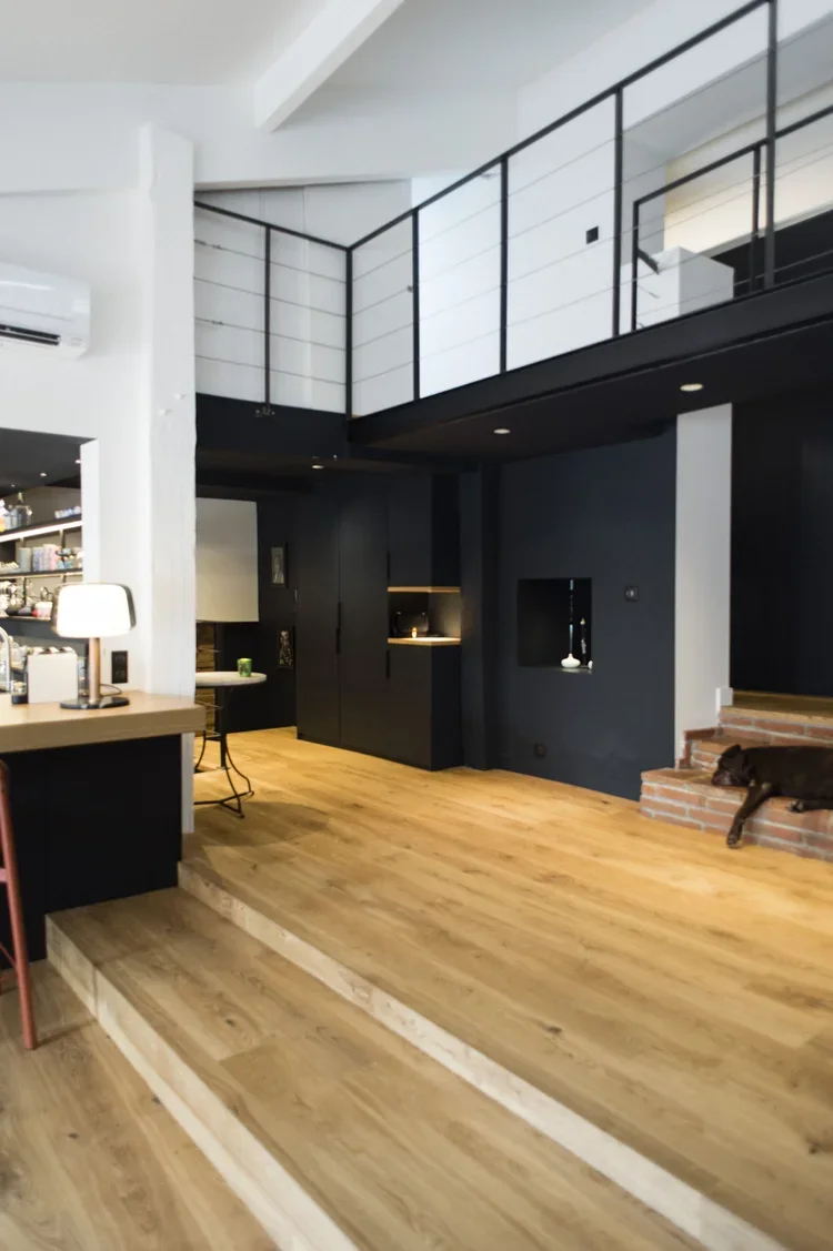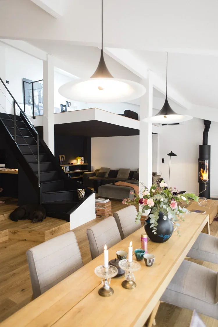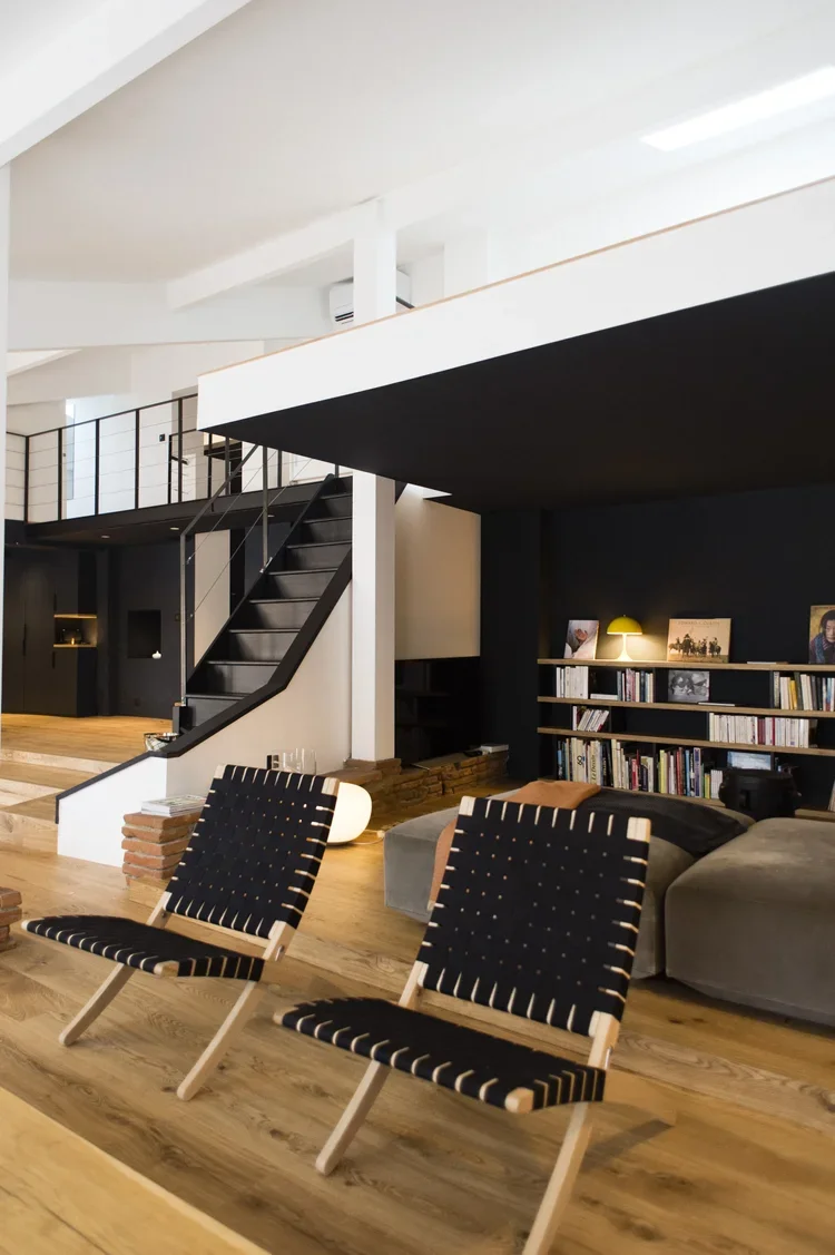 Cet appartement atypique esprit loft est le résultat d’une surélévation. L’atout majeur est une grande baie vitrée inondant de luminosité la pièce à vivre. Les passerelles et mezzanines créent des espaces intimistes tout en gardant le volume de la pièce. Des différences de niveaux du fait de la structure du bâtiment permet d’avoir des zones avec différentes fonctions : espace TV, Bureau, salon, espace repas… La cuisine devenant une partie intégrante du séjour a été conçu et réalisé sur mesure dans des matériaux associant chic et sobriété, en s’inspirant de l’esprit japonisant. La bibliothèque a été dessinée et réalisée sur mesure avec des matériaux faisant échos à la cuisine. La table de repas, et tables basses en chêne massif est dans l’esprit brut et usé. Un poêle posé pendant les travaux apporte chaleur et confort. Le contraste de teintes pour nuancer le volume de la pièce. Les meubles et luminaires Hans Wegner, Poulsen, Serge Mouille, Kann Design, And tradition vendus au showroom Christine Clavère.