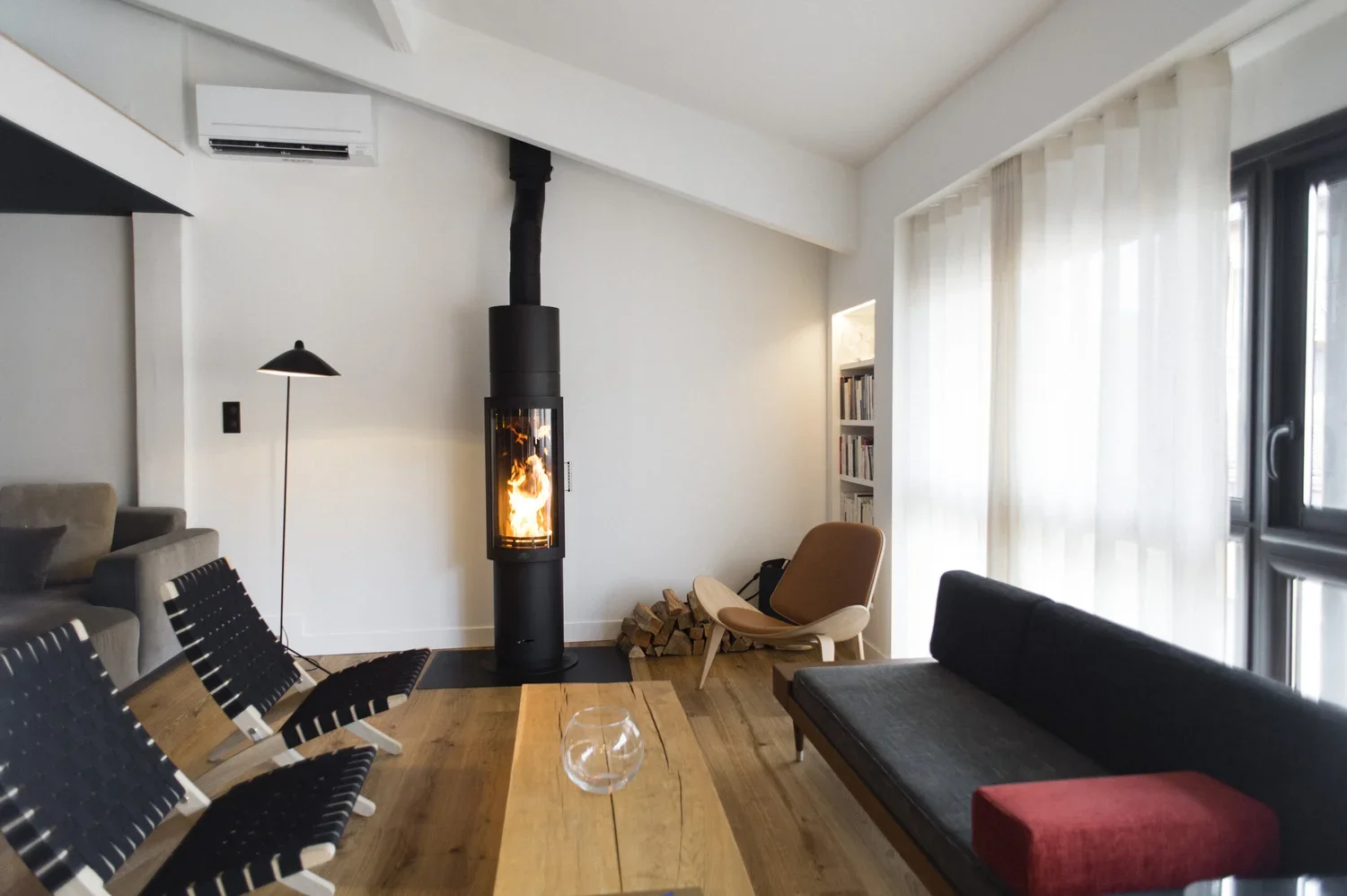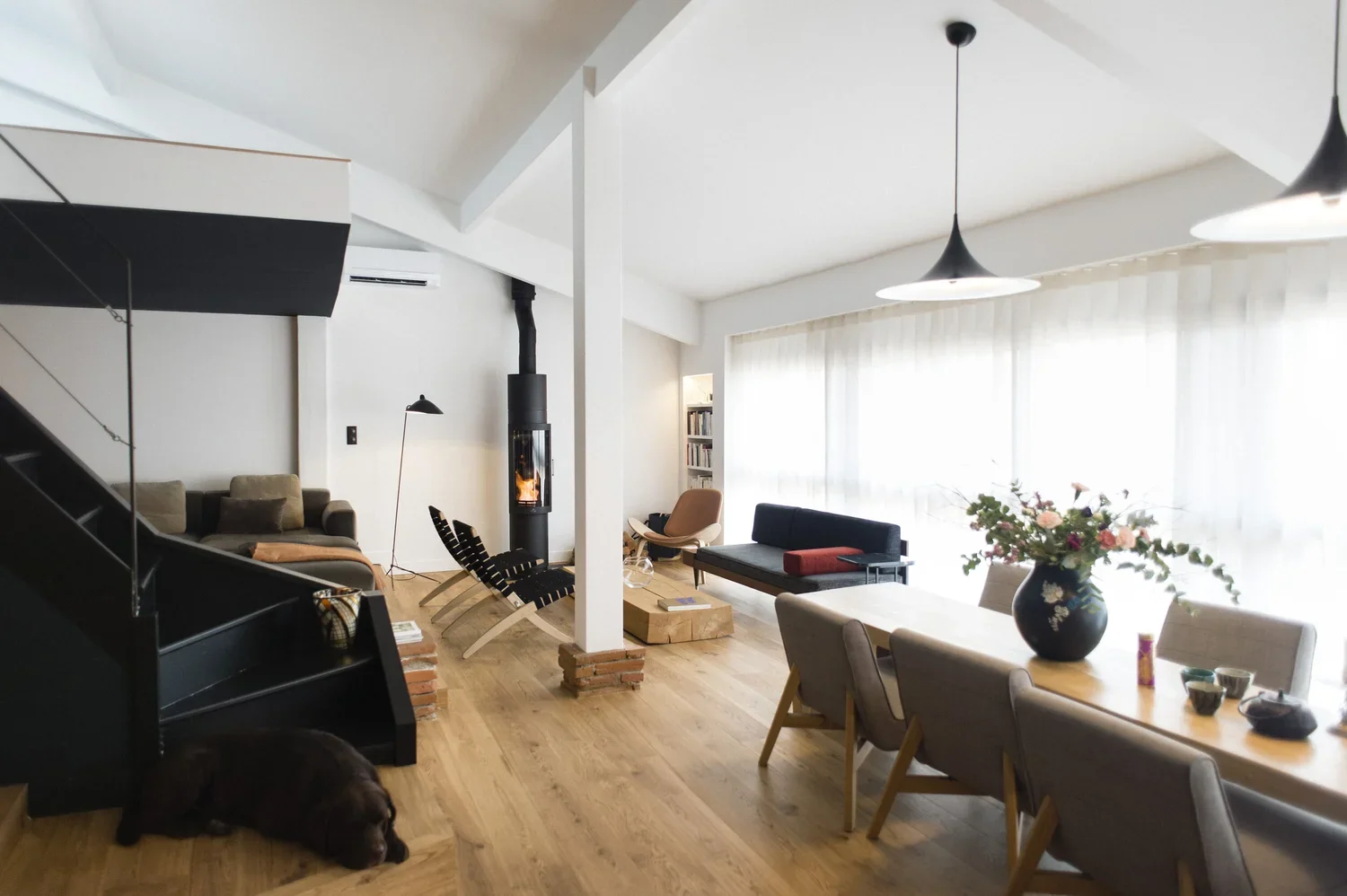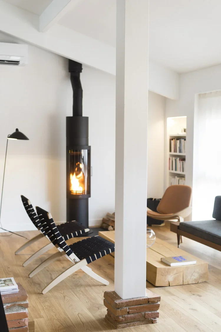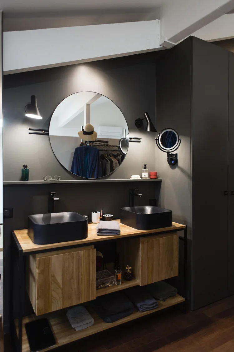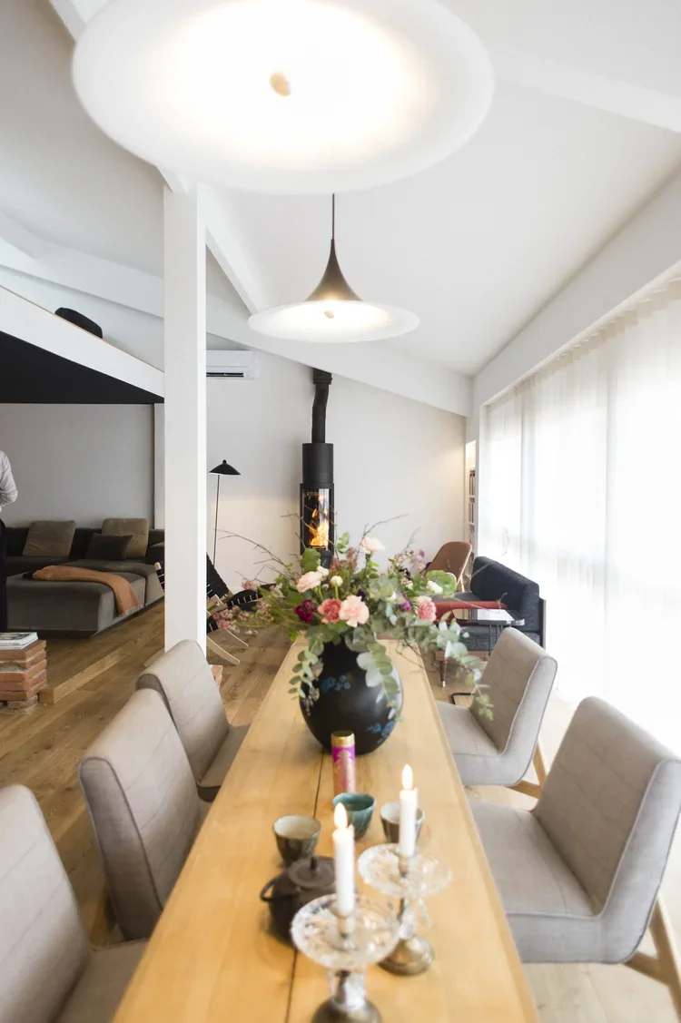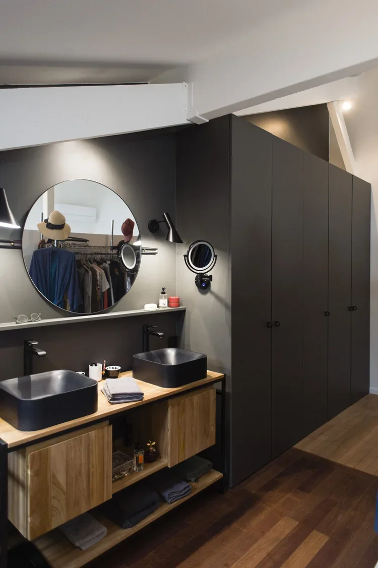Cet appartement atypique esprit loft est le résultat d’une surélévation. L’atout majeur est une grande baie vitrée inondant de luminosité la pièce à vivre. Les passerelles et mezzanines créent des espaces intimistes tout en gardant le volume de la pièce. Des différences de niveaux du fait de la structure du bâtiment permet d’avoir des zones avec différentes fonctions : espace TV, Bureau, salon, espace repas… La cuisine devenant une partie intégrante du séjour a été conçu et réalisé sur mesure dans des matériaux associant chic et sobriété, en s’inspirant de l’esprit japonisant. La bibliothèque a été dessinée et réalisée sur mesure avec des matériaux faisant échos à la cuisine. La table de repas, et tables basses en chêne massif est dans l’esprit brut et usé. Un poêle posé pendant les travaux apporte chaleur et confort. Le contraste de teintes pour nuancer le volume de la pièce. Les meubles et luminaires Hans Wegner, Poulsen, Serge Mouille, Kann Design, And tradition vendus au showroom Christine Clavère.