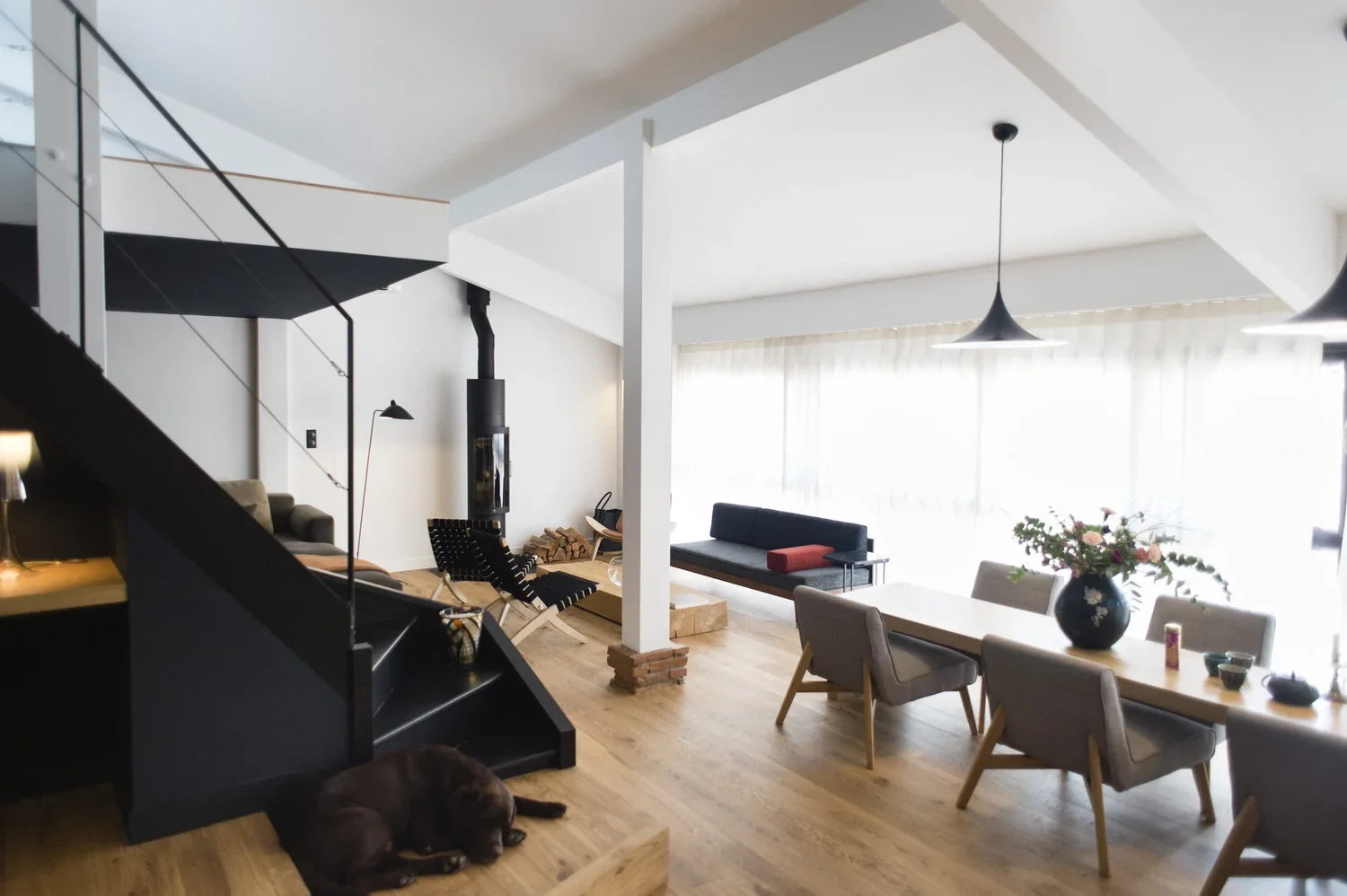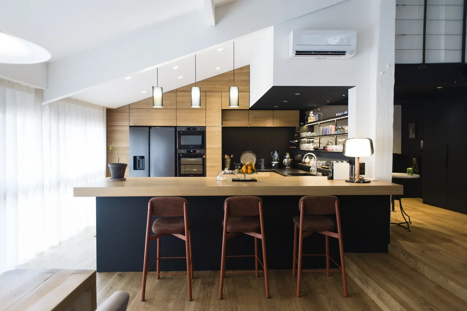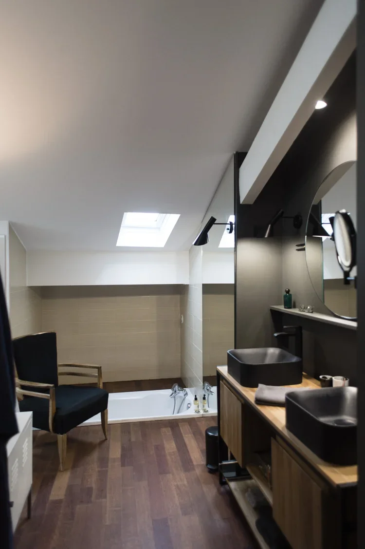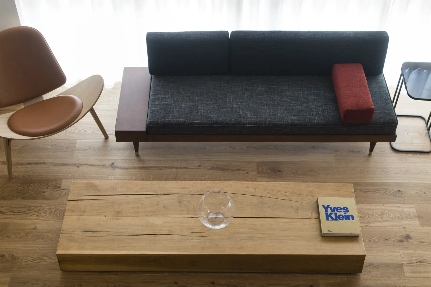 Cet appartement atypique esprit loft est le résultat d’une surélévation. L’atout majeur est une grande baie vitrée inondant de luminosité la pièce à vivre. Les passerelles et mezzanines créent des espaces intimistes tout en gardant le volume de la pièce. Des différences de niveaux du fait de la structure du bâtiment permet d’avoir des zones avec différentes fonctions : espace TV, Bureau, salon, espace repas… La cuisine devenant une partie intégrante du séjour a été conçu et réalisé sur mesure dans des matériaux associant chic et sobriété, en s’inspirant de l’esprit japonisant. La bibliothèque a été dessinée et réalisée sur mesure avec des matériaux faisant échos à la cuisine. La table de repas, et tables basses en chêne massif est dans l’esprit brut et usé. Un poêle posé pendant les travaux apporte chaleur et confort. Le contraste de teintes pour nuancer le volume de la pièce. Les meubles et luminaires Hans Wegner, Poulsen, Serge Mouille, Kann Design, And tradition vendus au showroom Christine Clavère.