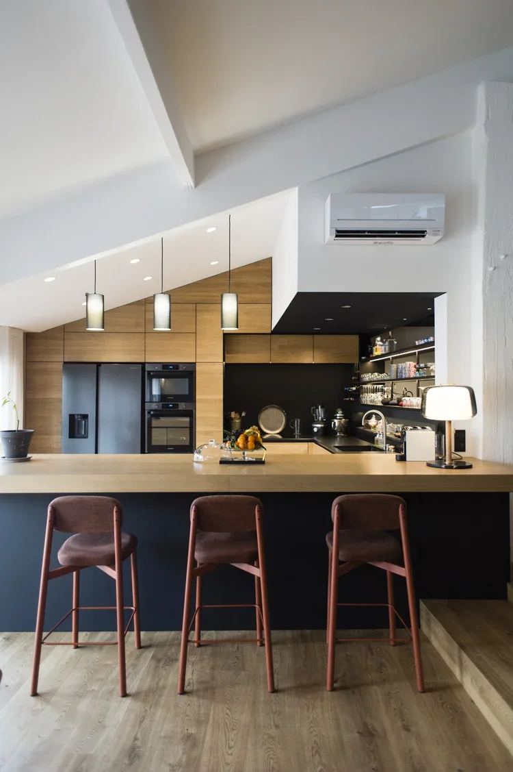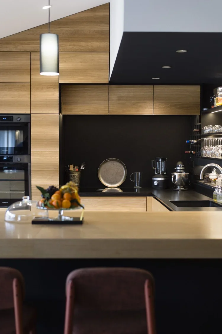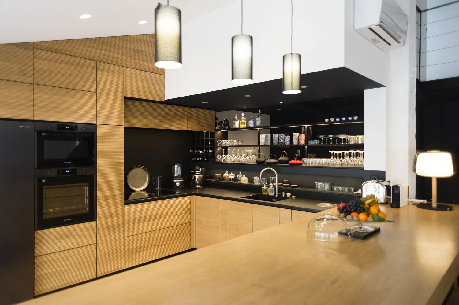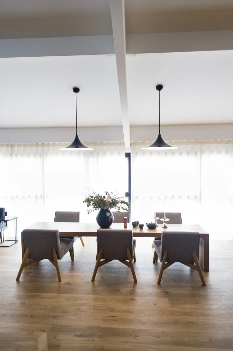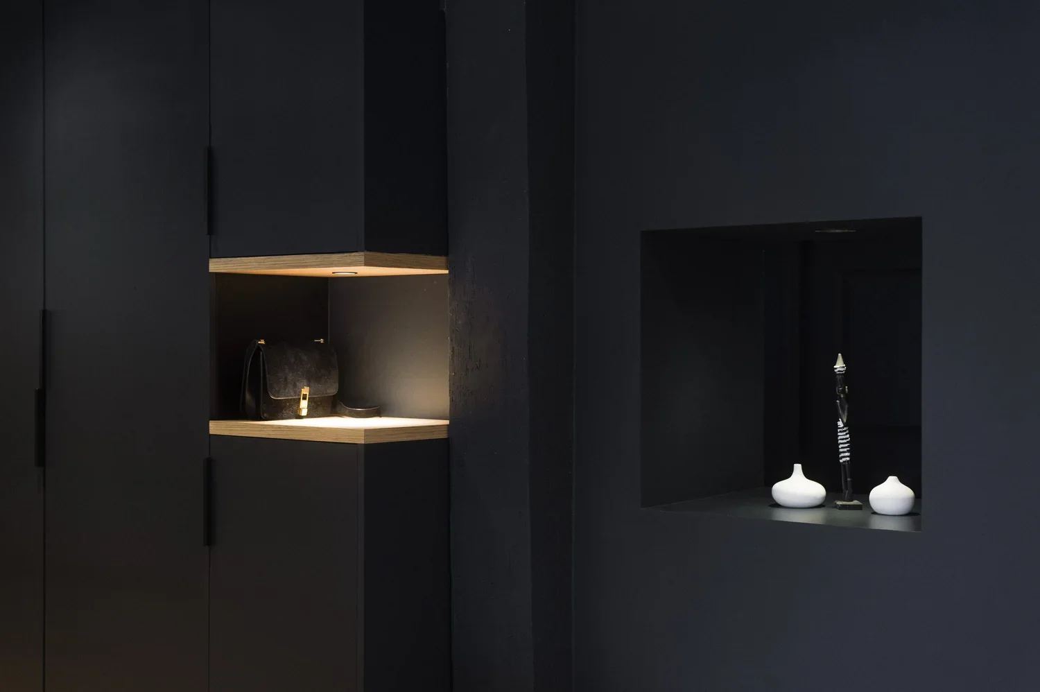 Cet appartement atypique esprit loft est le résultat d’une surélévation. L’atout majeur est une grande baie vitrée inondant de luminosité la pièce à vivre. Les passerelles et mezzanines créent des espaces intimistes tout en gardant le volume de la pièce. Des différences de niveaux du fait de la structure du bâtiment permet d’avoir des zones avec différentes fonctions : espace TV, Bureau, salon, espace repas… La cuisine devenant une partie intégrante du séjour a été conçu et réalisé sur mesure dans des matériaux associant chic et sobriété, en s’inspirant de l’esprit japonisant. La bibliothèque a été dessinée et réalisée sur mesure avec des matériaux faisant échos à la cuisine. La table de repas, et tables basses en chêne massif est dans l’esprit brut et usé. Un poêle posé pendant les travaux apporte chaleur et confort. Le contraste de teintes pour nuancer le volume de la pièce. Les meubles et luminaires Hans Wegner, Poulsen, Serge Mouille, Kann Design, And tradition vendus au showroom Christine Clavère.