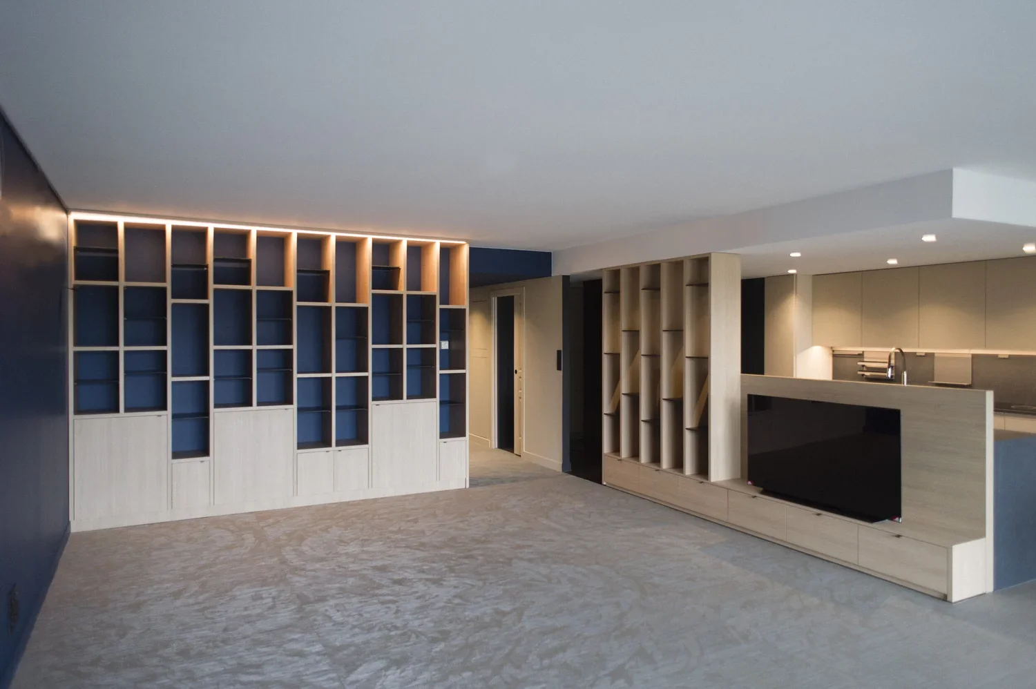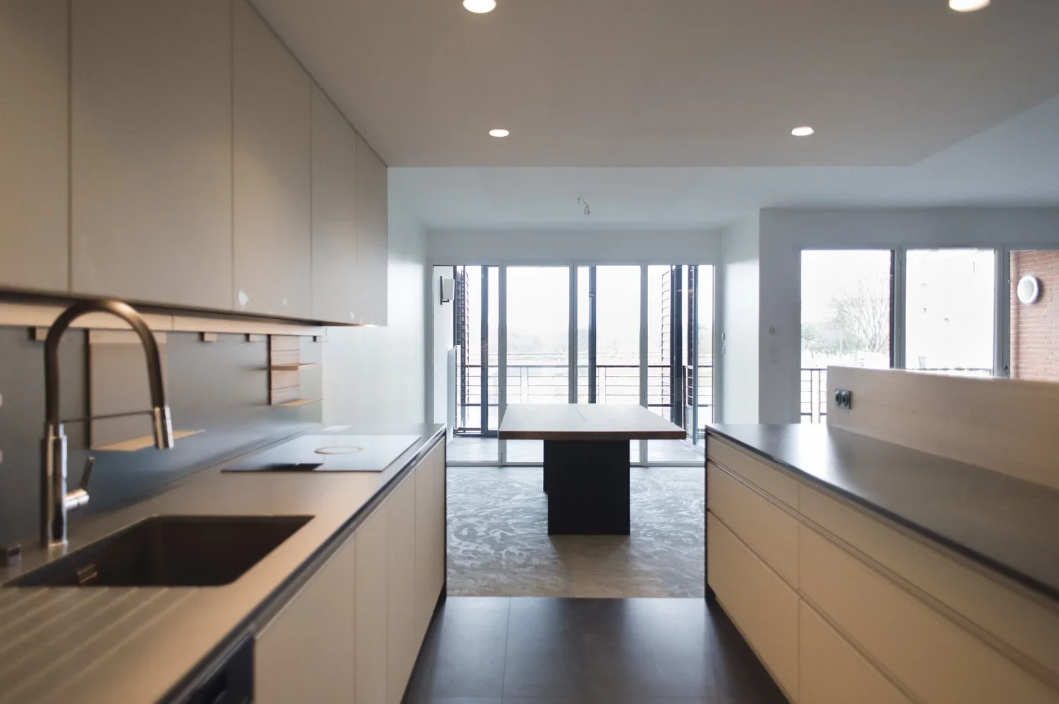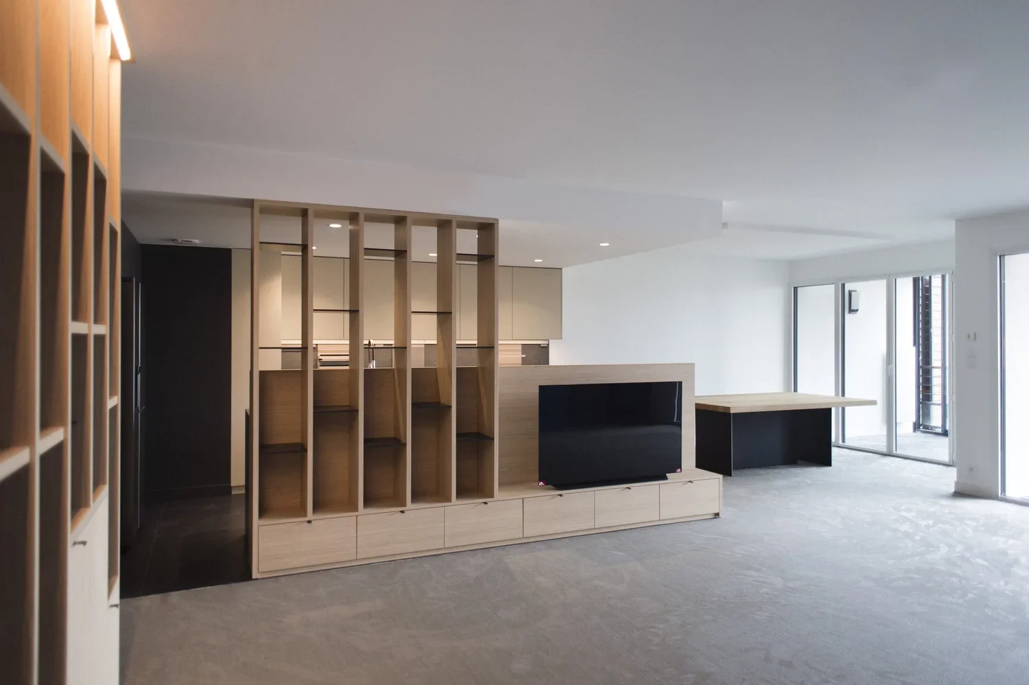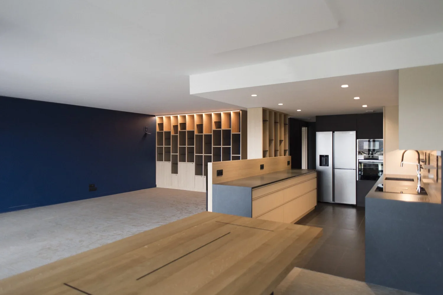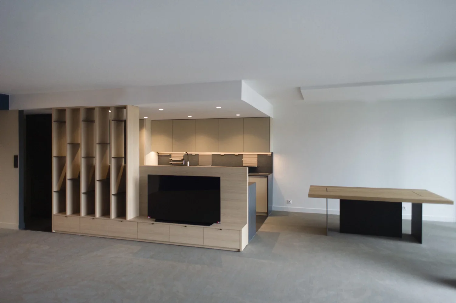 L’objectif du projet a été d'orienter le regard sur la perspective et le potentiel majeur : la vue ouverte sur la Garonne. En bon état, à priori, mais manquant de chaleur et de charme par ces matériaux ; carrelage basique au sol, cloisons en placopan, sanitaire vieillot. Il disposait de trois chambres avec deux salles de bain et une grande pièce à vivre. Les cloisons ont été remaniées de manière à redistribuer l’espace pour la réalisation d’une grande suite parentale avec dressing, salle de bain et bureau attenant, une chambre d’amis avec sa salle d’eau, le tout communiquant avec des portes dérobées et à glandage. Le mobilier et l’agencement (cuisine et meuble vasque compris) ont été conçus et réalisés sur mesure avec des matériaux nobles comme le chêne et l’acier massif pour la table de repas. Le sol a été recouvert d’un bolon pour amener de la chaleur et palier à la problématique de la hauteur disponible avec l’ouverture des baies vitrée. Les couleurs et le papier peint ont été choisis en collaboration avec les maitres d’ouvrage. Durée du chantier : trois mois.