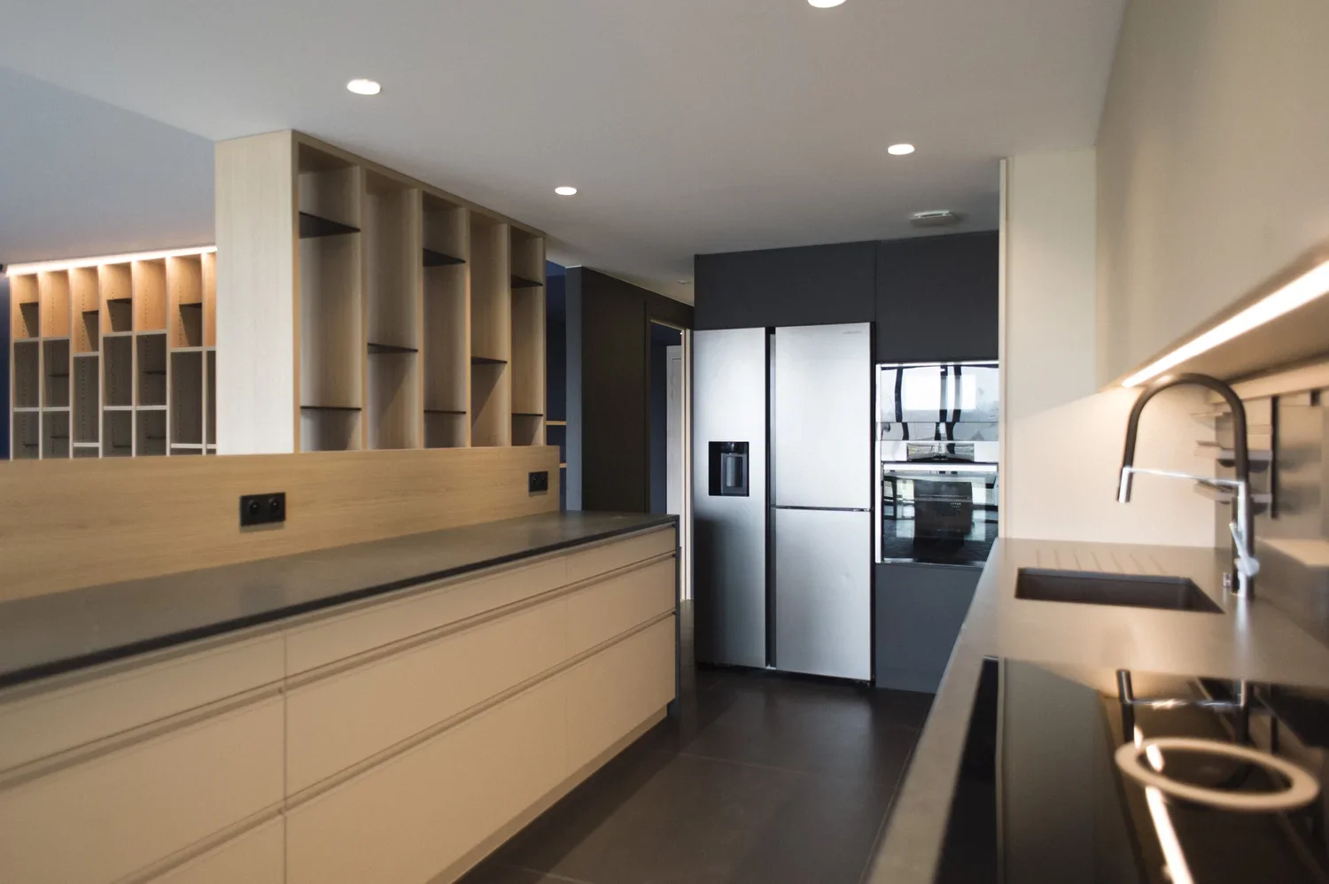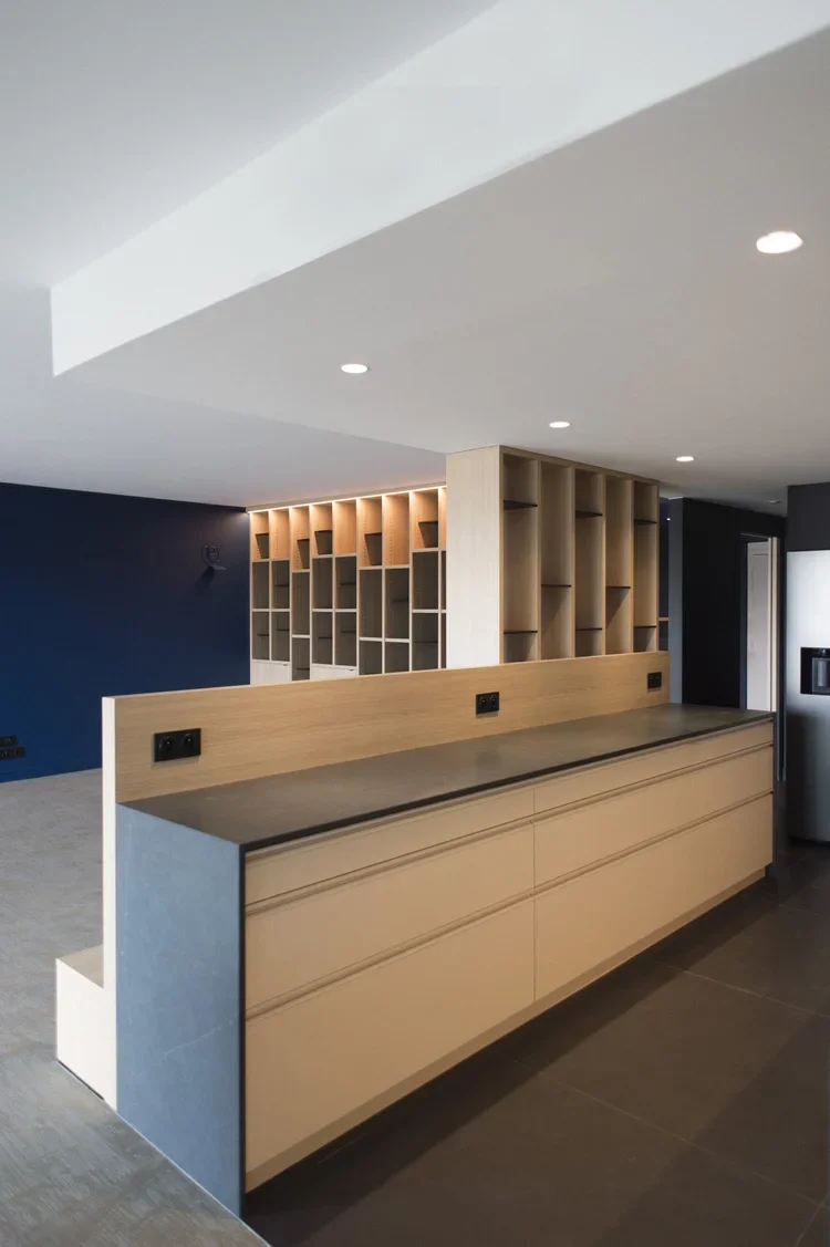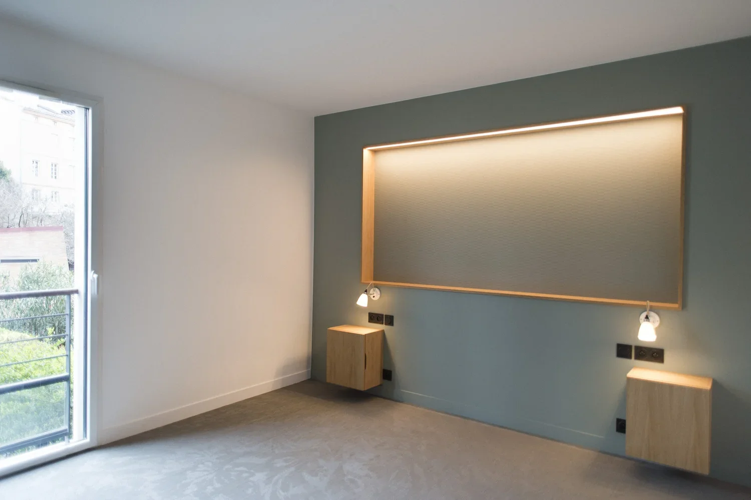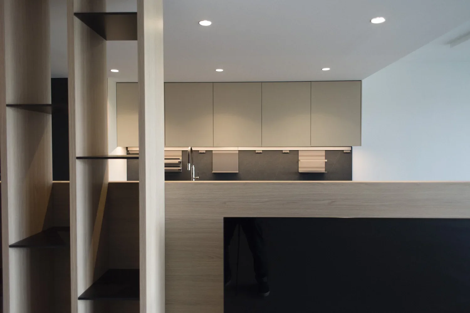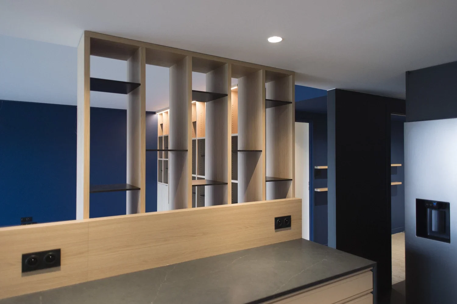 L’objectif du projet a été d'orienter le regard sur la perspective et le potentiel majeur : la vue ouverte sur la Garonne. En bon état, à priori, mais manquant de chaleur et de charme par ces matériaux ; carrelage basique au sol, cloisons en placopan, sanitaire vieillot. Il disposait de trois chambres avec deux salles de bain et une grande pièce à vivre. Les cloisons ont été remaniées de manière à redistribuer l’espace pour la réalisation d’une grande suite parentale avec dressing, salle de bain et bureau attenant, une chambre d’amis avec sa salle d’eau, le tout communiquant avec des portes dérobées et à glandage. Le mobilier et l’agencement (cuisine et meuble vasque compris) ont été conçus et réalisés sur mesure avec des matériaux nobles comme le chêne et l’acier massif pour la table de repas. Le sol a été recouvert d’un bolon pour amener de la chaleur et palier à la problématique de la hauteur disponible avec l’ouverture des baies vitrée. Les couleurs et le papier peint ont été choisis en collaboration avec les maitres d’ouvrage. Durée du chantier : trois mois.