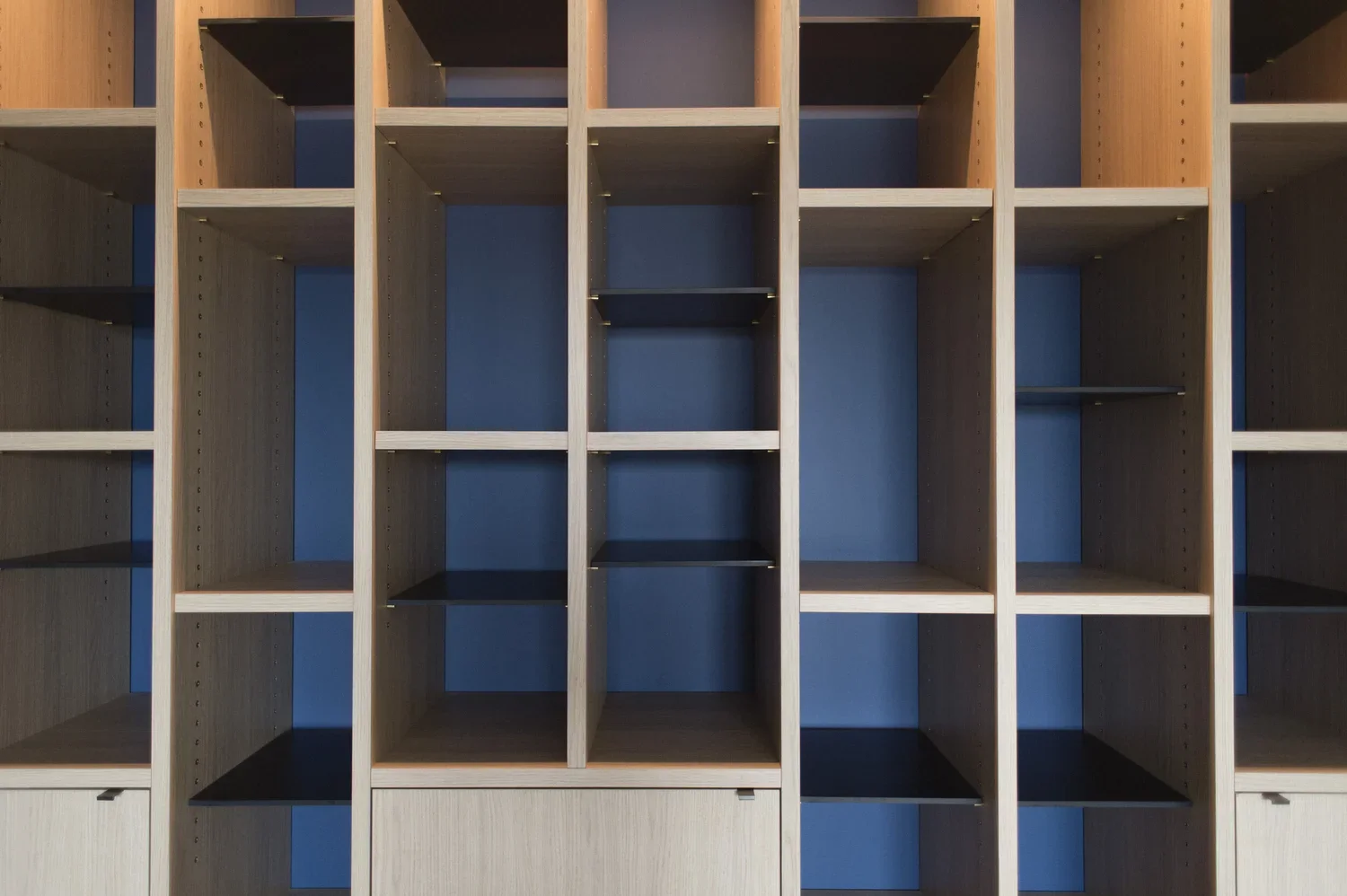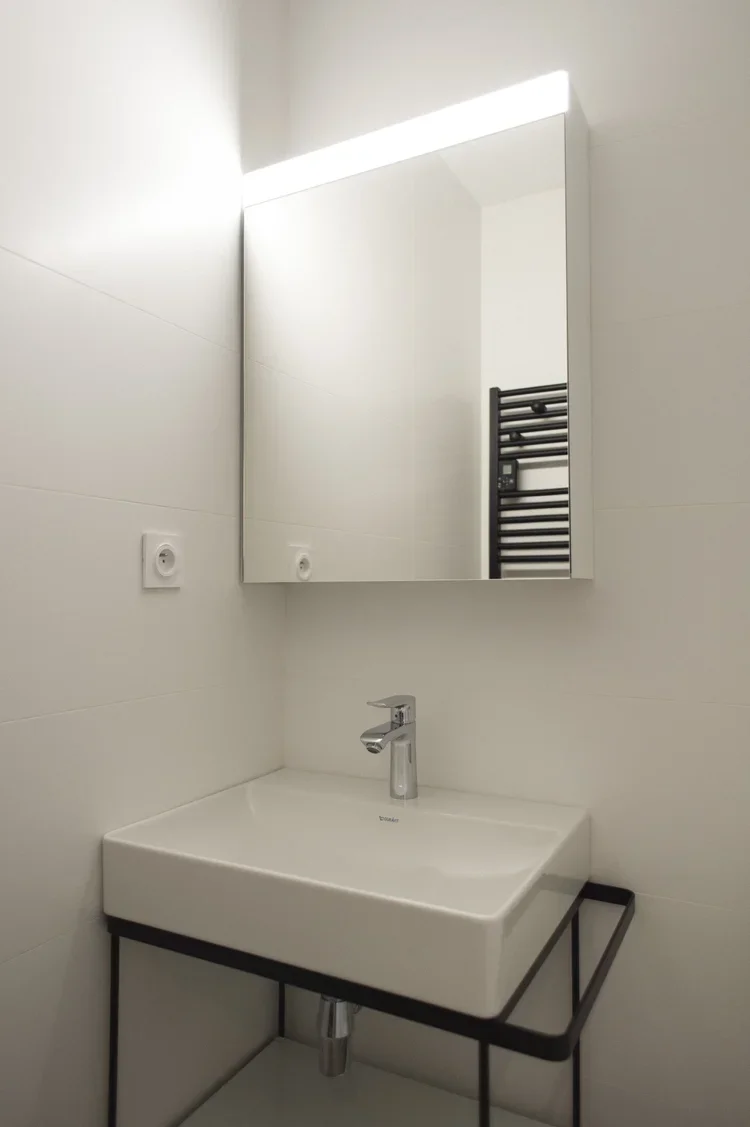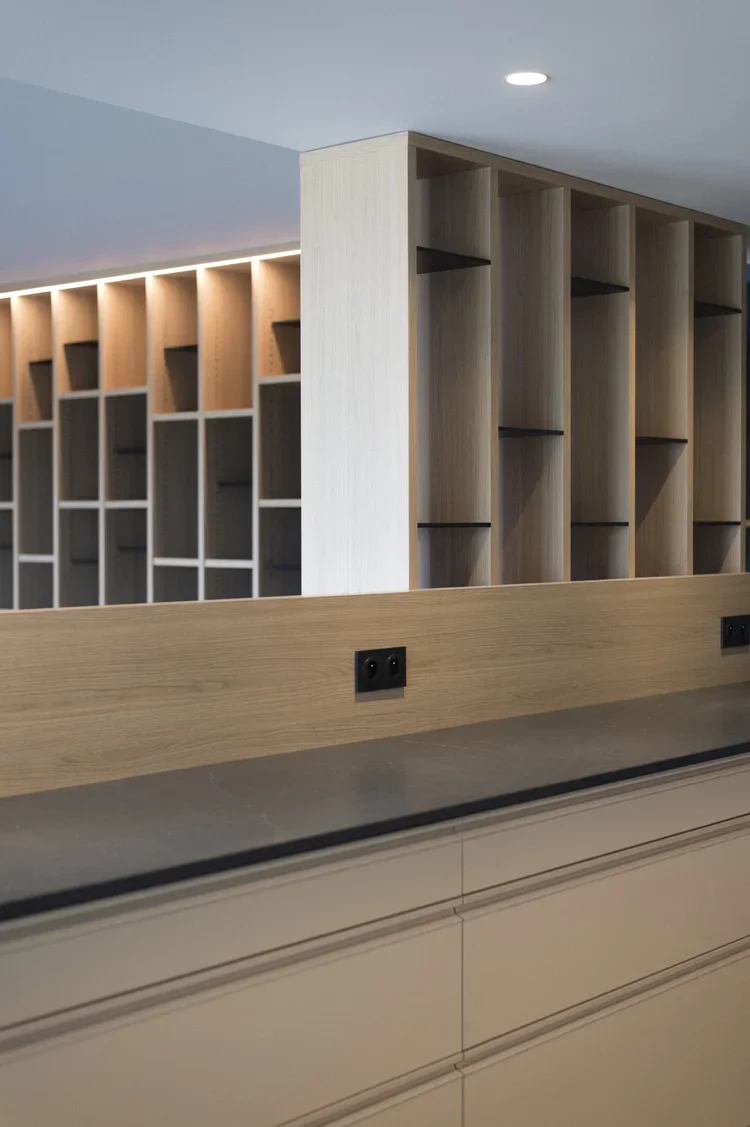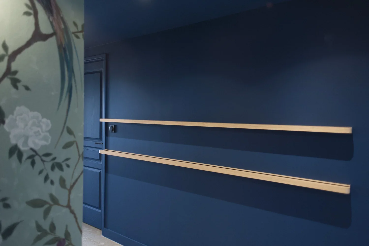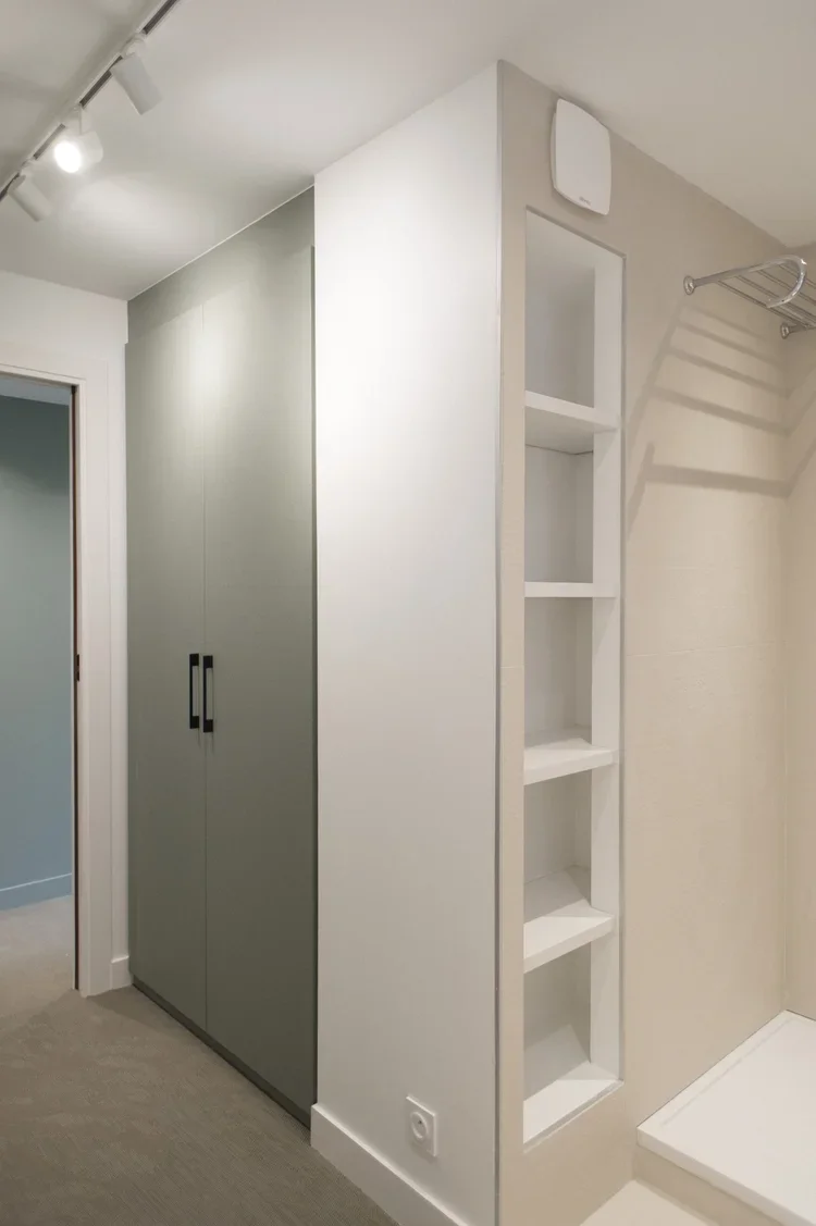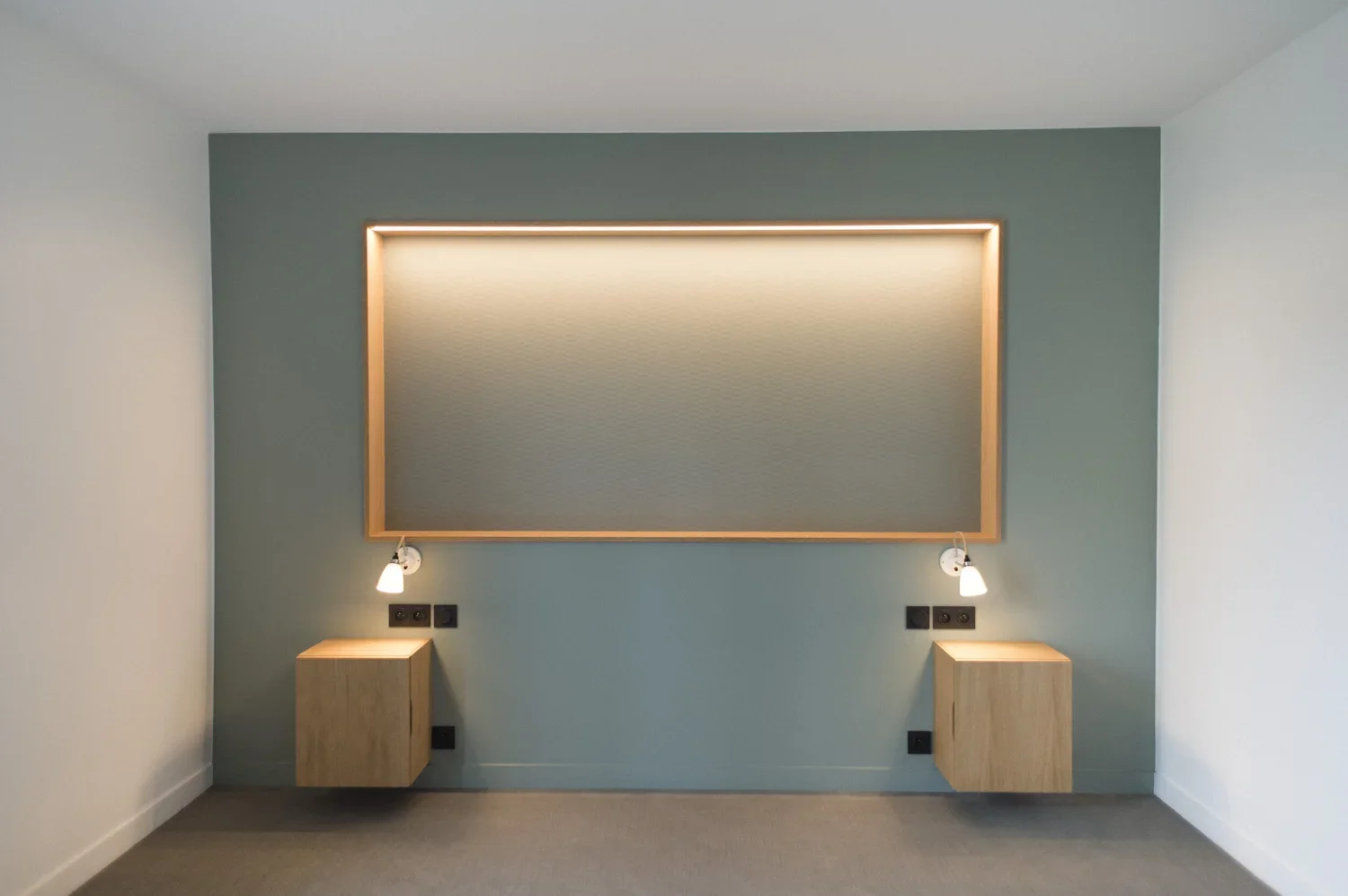 L’objectif du projet a été d'orienter le regard sur la perspective et le potentiel majeur : la vue ouverte sur la Garonne. En bon état, à priori, mais manquant de chaleur et de charme par ces matériaux ; carrelage basique au sol, cloisons en placopan, sanitaire vieillot. Il disposait de trois chambres avec deux salles de bain et une grande pièce à vivre. Les cloisons ont été remaniées de manière à redistribuer l’espace pour la réalisation d’une grande suite parentale avec dressing, salle de bain et bureau attenant, une chambre d’amis avec sa salle d’eau, le tout communiquant avec des portes dérobées et à glandage. Le mobilier et l’agencement (cuisine et meuble vasque compris) ont été conçus et réalisés sur mesure avec des matériaux nobles comme le chêne et l’acier massif pour la table de repas. Le sol a été recouvert d’un bolon pour amener de la chaleur et palier à la problématique de la hauteur disponible avec l’ouverture des baies vitrée. Les couleurs et le papier peint ont été choisis en collaboration avec les maitres d’ouvrage. Durée du chantier : trois mois.
