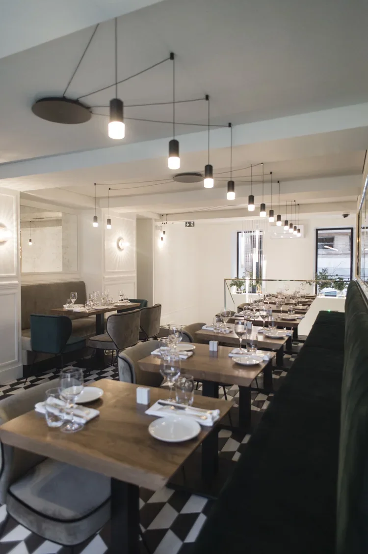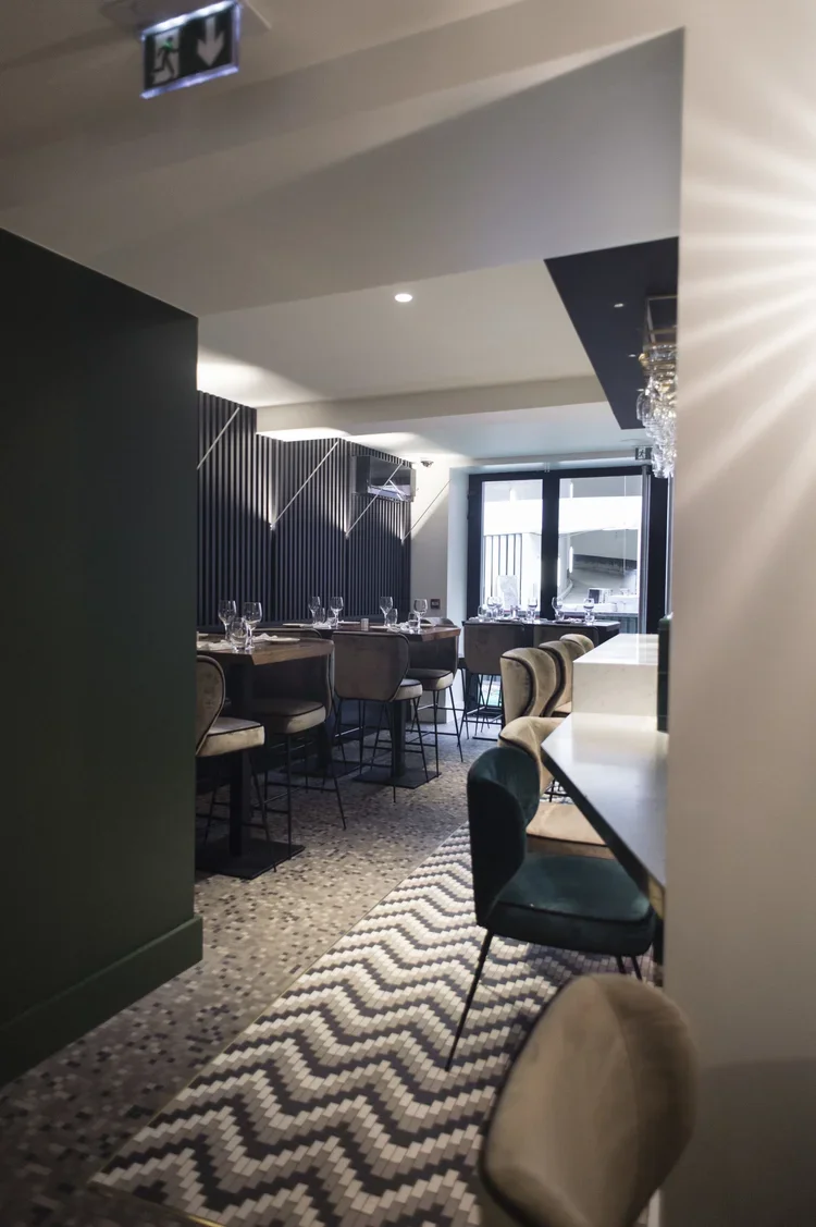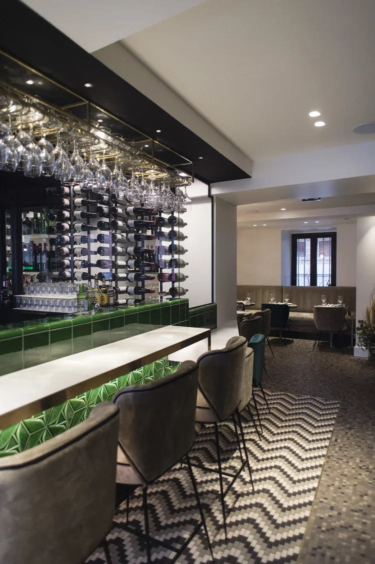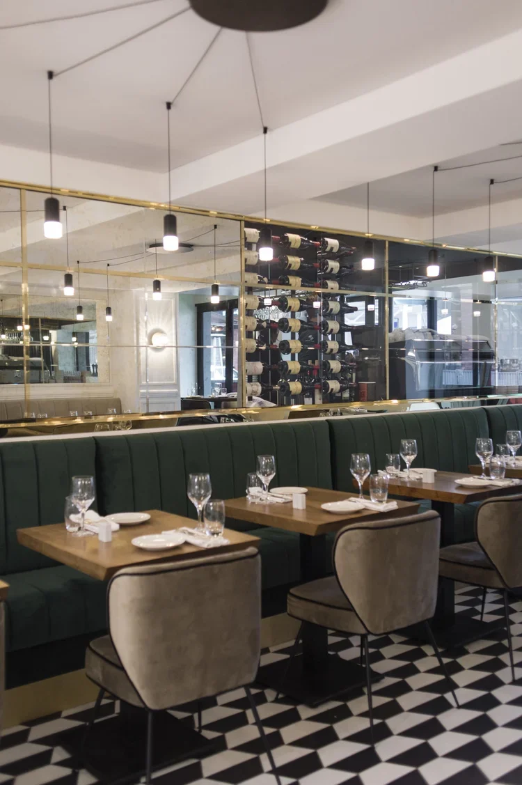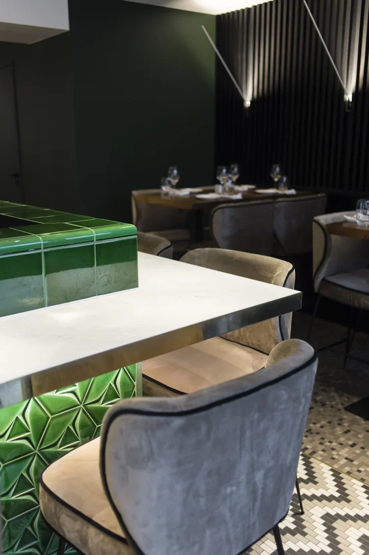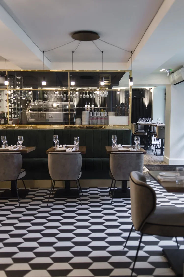 Anciennement bar/restaurant, séparés par un couloir d’immeuble, c’est aujourd’hui un espace ouvert et clair, articulé autour d’un bar central, que nous voulions fort et emblématique pour le lieu. La mosaïque verte donne le ton, la partie vitrée sur la cave ne cache rien des coulisses. Une transparence est présente sur la grande partie vitrée longeant les banquettes, structurée de miroirs vieillis et de laiton , elle permet d’isoler le restaurant dans son écrin tout en conservant cette unité de lieu de vie.