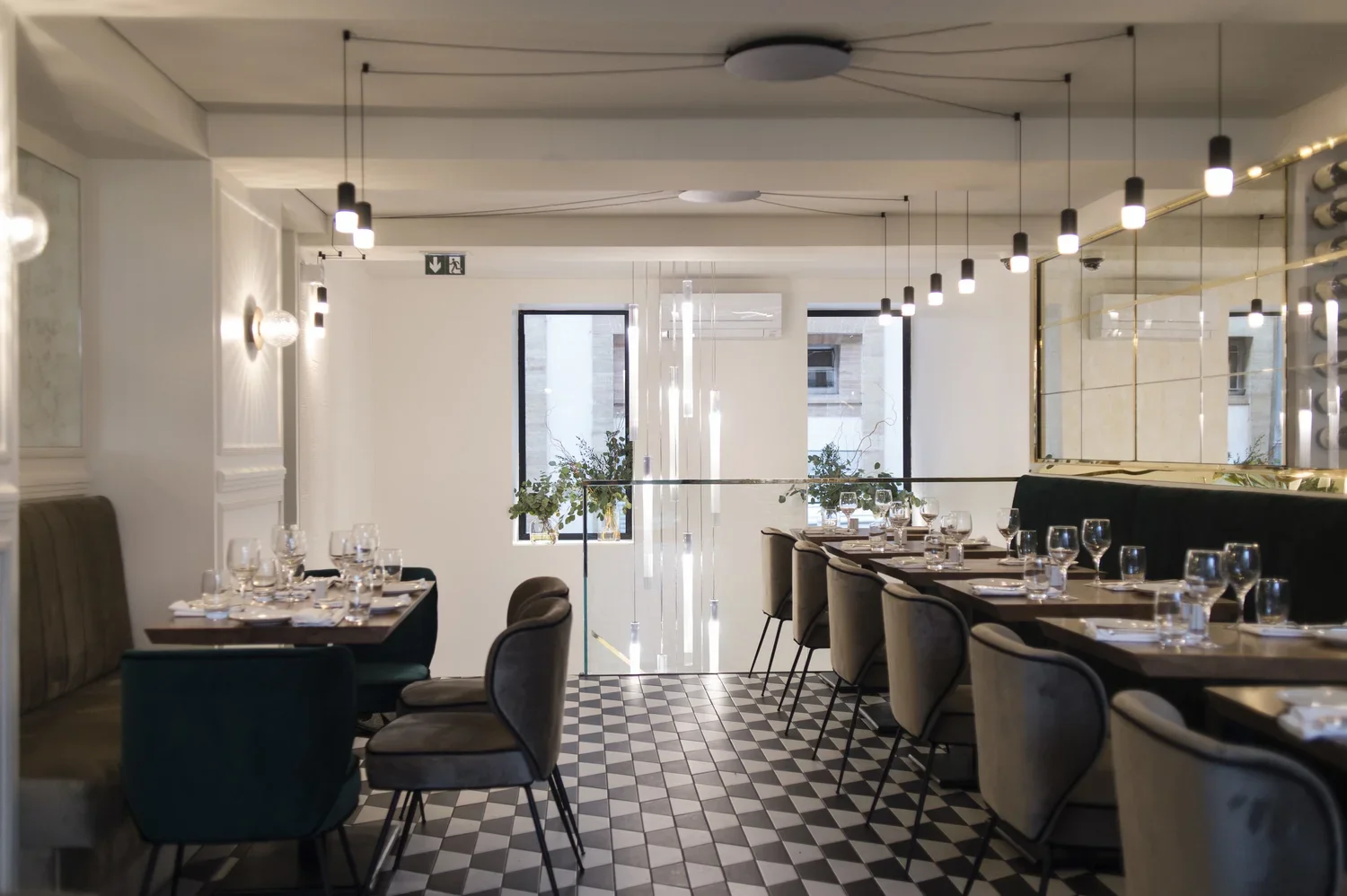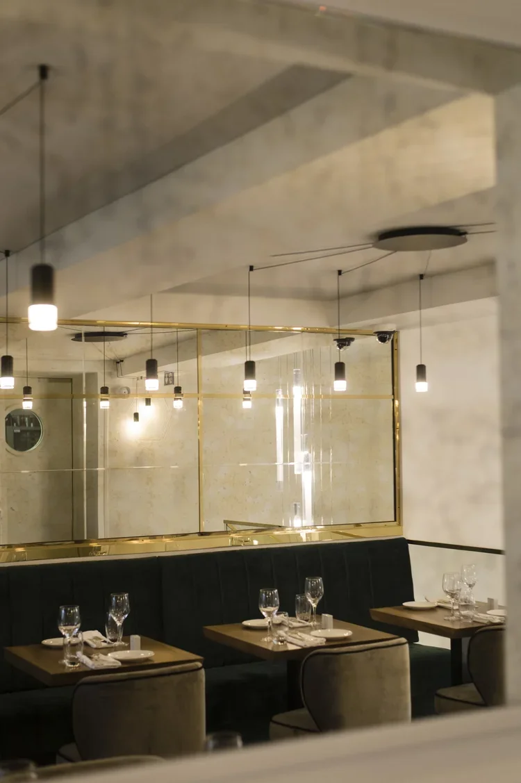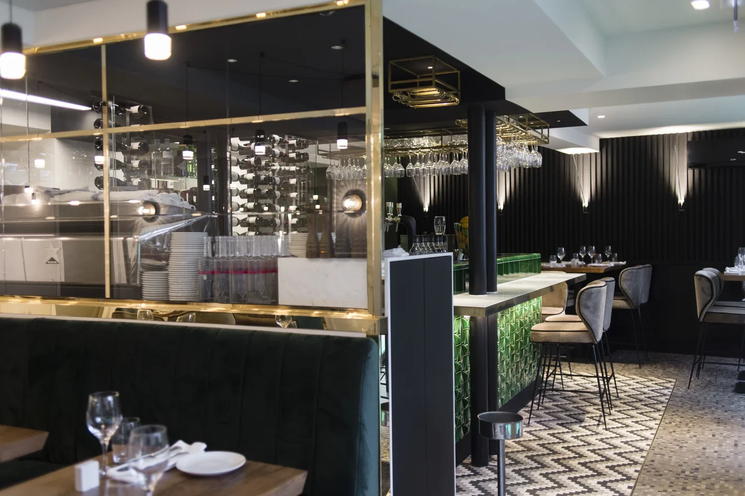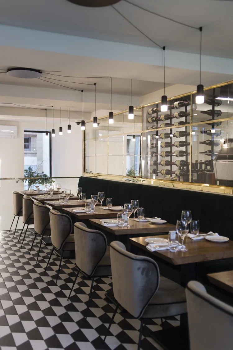 Anciennement bar/restaurant, séparés par un couloir d’immeuble, c’est aujourd’hui un espace ouvert et clair, articulé autour d’un bar central, que nous voulions fort et emblématique pour le lieu. La mosaïque verte donne le ton, la partie vitrée sur la cave ne cache rien des coulisses. Une transparence est présente sur la grande partie vitrée longeant les banquettes, structurée de miroirs vieillis et de laiton , elle permet d’isoler le restaurant dans son écrin tout en conservant cette unité de lieu de vie.