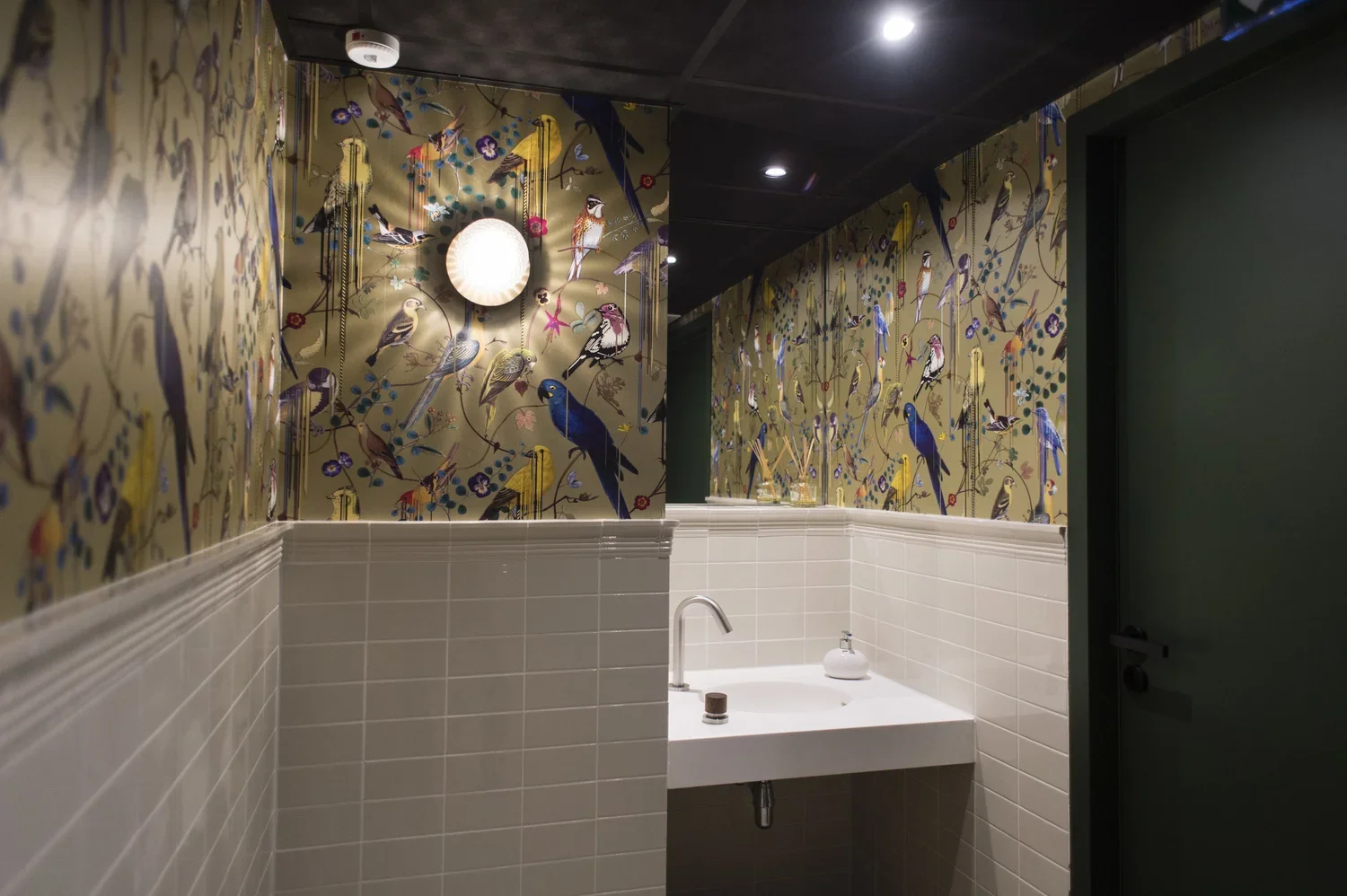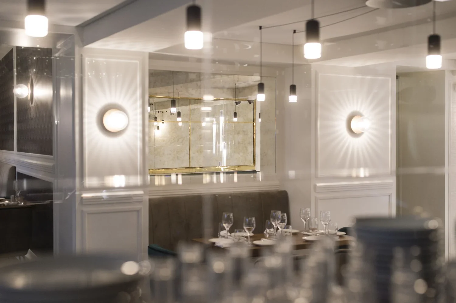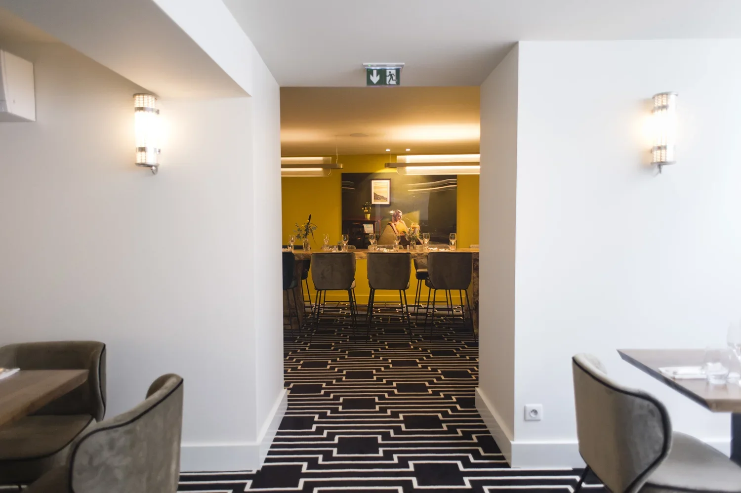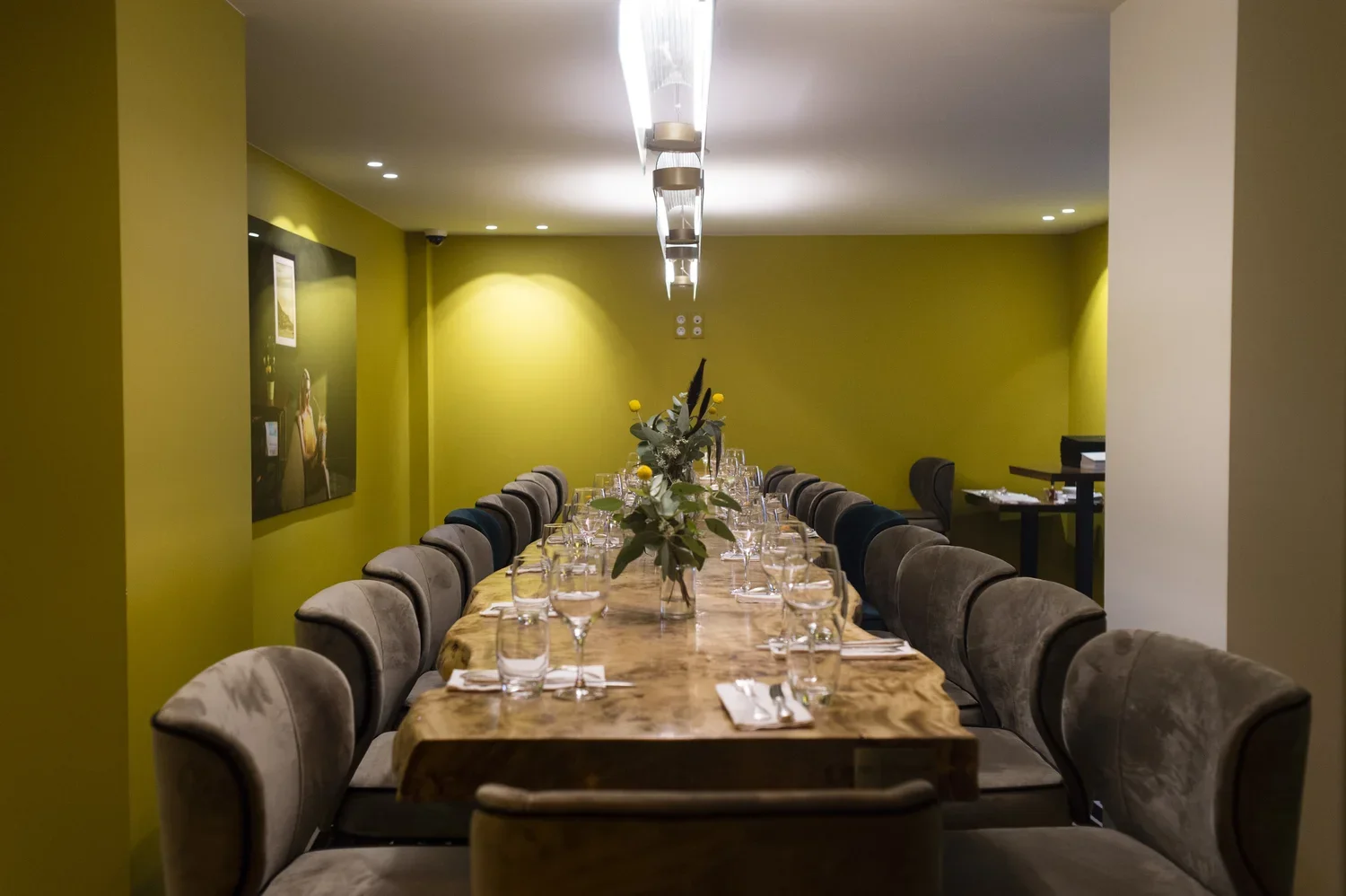 Anciennement bar/restaurant, séparés par un couloir d’immeuble, c’est aujourd’hui un espace ouvert et clair, articulé autour d’un bar central, que nous voulions fort et emblématique pour le lieu. La mosaïque verte donne le ton, la partie vitrée sur la cave ne cache rien des coulisses. Une transparence est présente sur la grande partie vitrée longeant les banquettes, structurée de miroirs vieillis et de laiton , elle permet d’isoler le restaurant dans son écrin tout en conservant cette unité de lieu de vie.