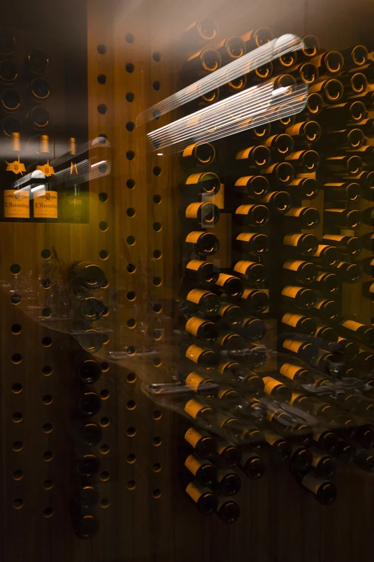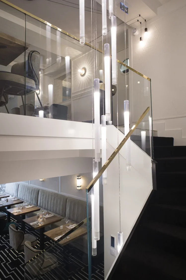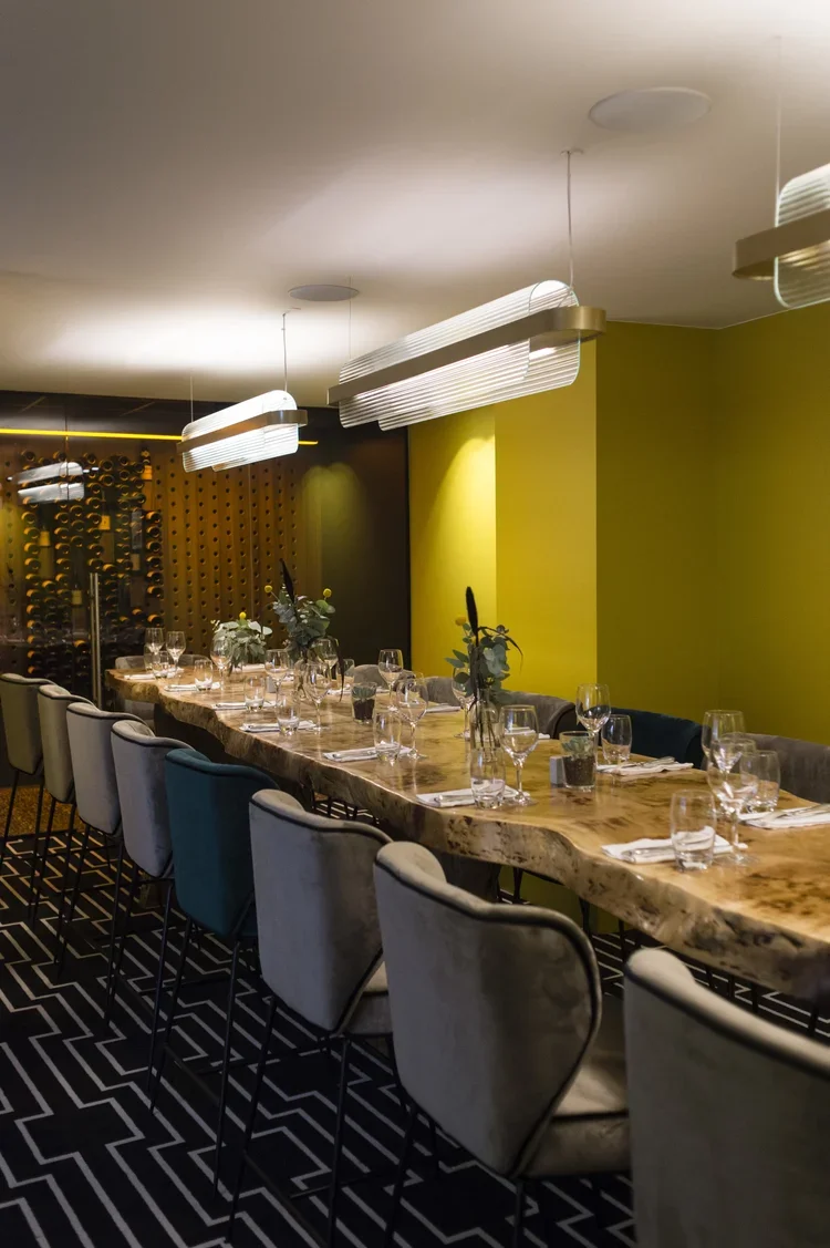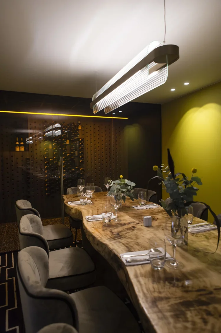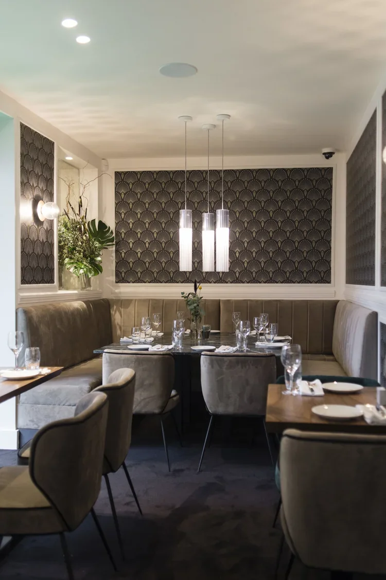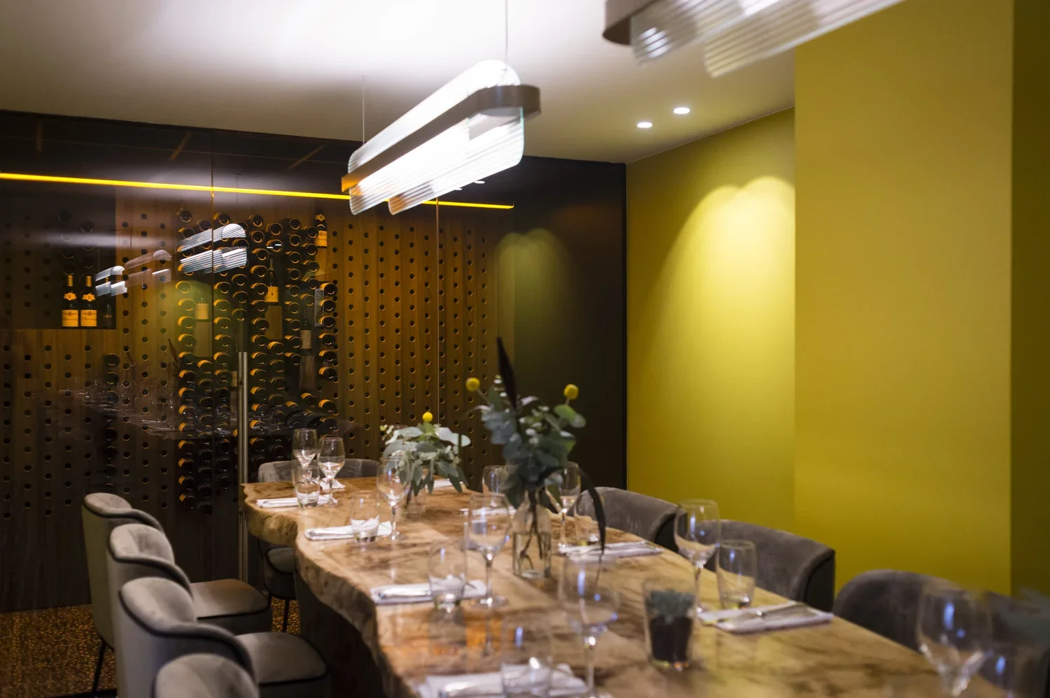 Anciennement bar/restaurant, séparés par un couloir d’immeuble, c’est aujourd’hui un espace ouvert et clair, articulé autour d’un bar central, que nous voulions fort et emblématique pour le lieu. La mosaïque verte donne le ton, la partie vitrée sur la cave ne cache rien des coulisses. Une transparence est présente sur la grande partie vitrée longeant les banquettes, structurée de miroirs vieillis et de laiton , elle permet d’isoler le restaurant dans son écrin tout en conservant cette unité de lieu de vie.