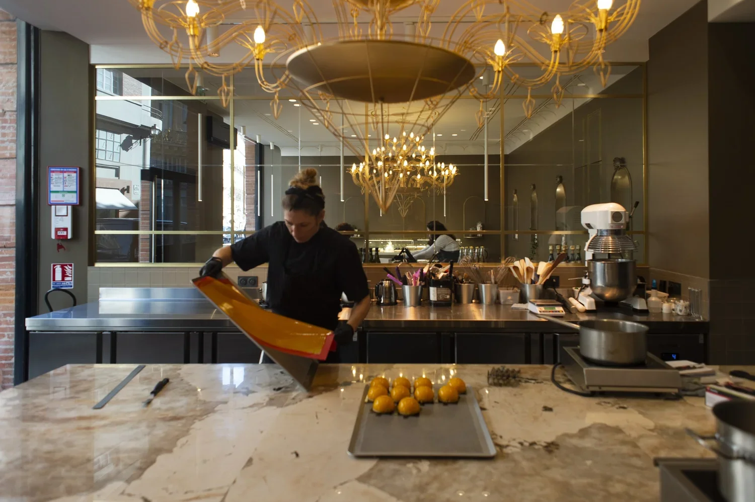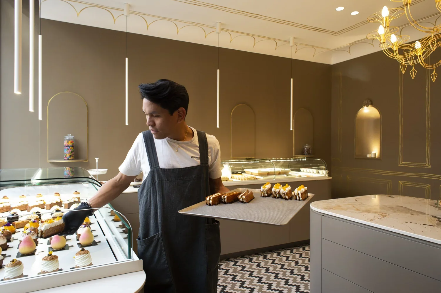 Ce nouveau lieu, en écho aux restaurants La Gourmandine, a été travaillé en deux parties : un côté atelier pâtisserie et un côté boutique, séparés par une magnifique verrière en laiton sur mesure dont le verre a été taillé en biseau. Pour sublimer leurs créations gourmandes dans un environnement élégant, des esquisses dorées de moulures ont été peintes à main levée, en plus des luminaires effet Versailles qui apportent une touche de chic.