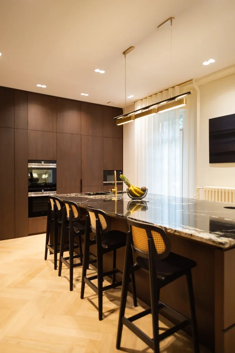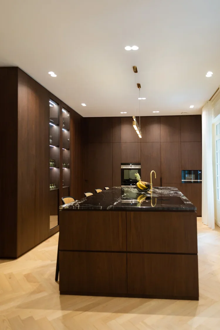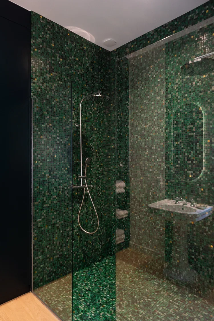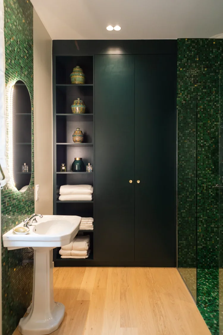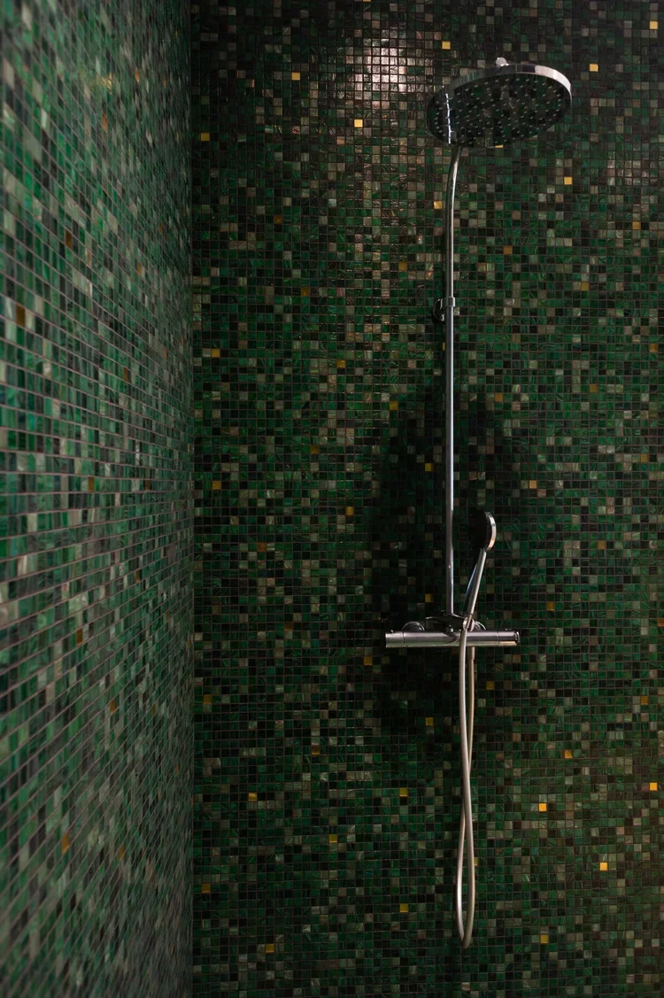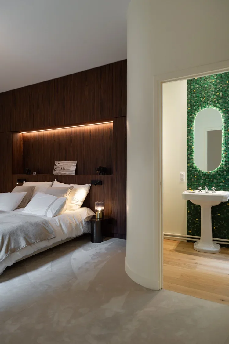 La pièce maitresse de cette chartreuse paisible de 215 m² située en plein cœur de Toulouse est évidemment la cuisine. La finition en noyer d’Amérique de chez Oberflex crée tout le caractère de cet espace. La cuisine sombre au granit veiné assume sa place dans ce lieu lumineux. Un seul et même espace, mais des zones délimitées : la cuisine, le salon et la salle à manger se succèdent sans souci. Les luminaires de chez Bert Frank viennent apporter de la brillance par le laiton et une touche de délicatesse. Quant à la suite parentale, elle a été pensée comme un cocon de douceur, entre la moquette au sol et les lumières indirectes. La salle de bain est conçue comme une enveloppe grâce aux murs de mosaïques Bisazza et à la peinture choisie dans un vert profond. Ce projet joue avec le clair/obscur et s’affranchi des difficultés que peuvent poser des choix de matériaux sombres.