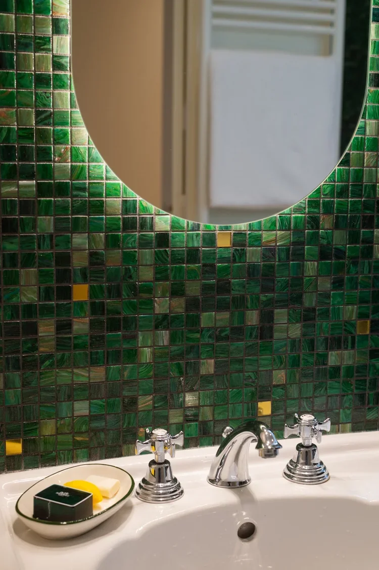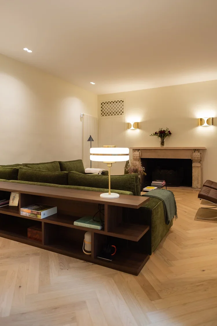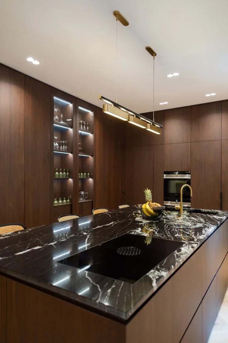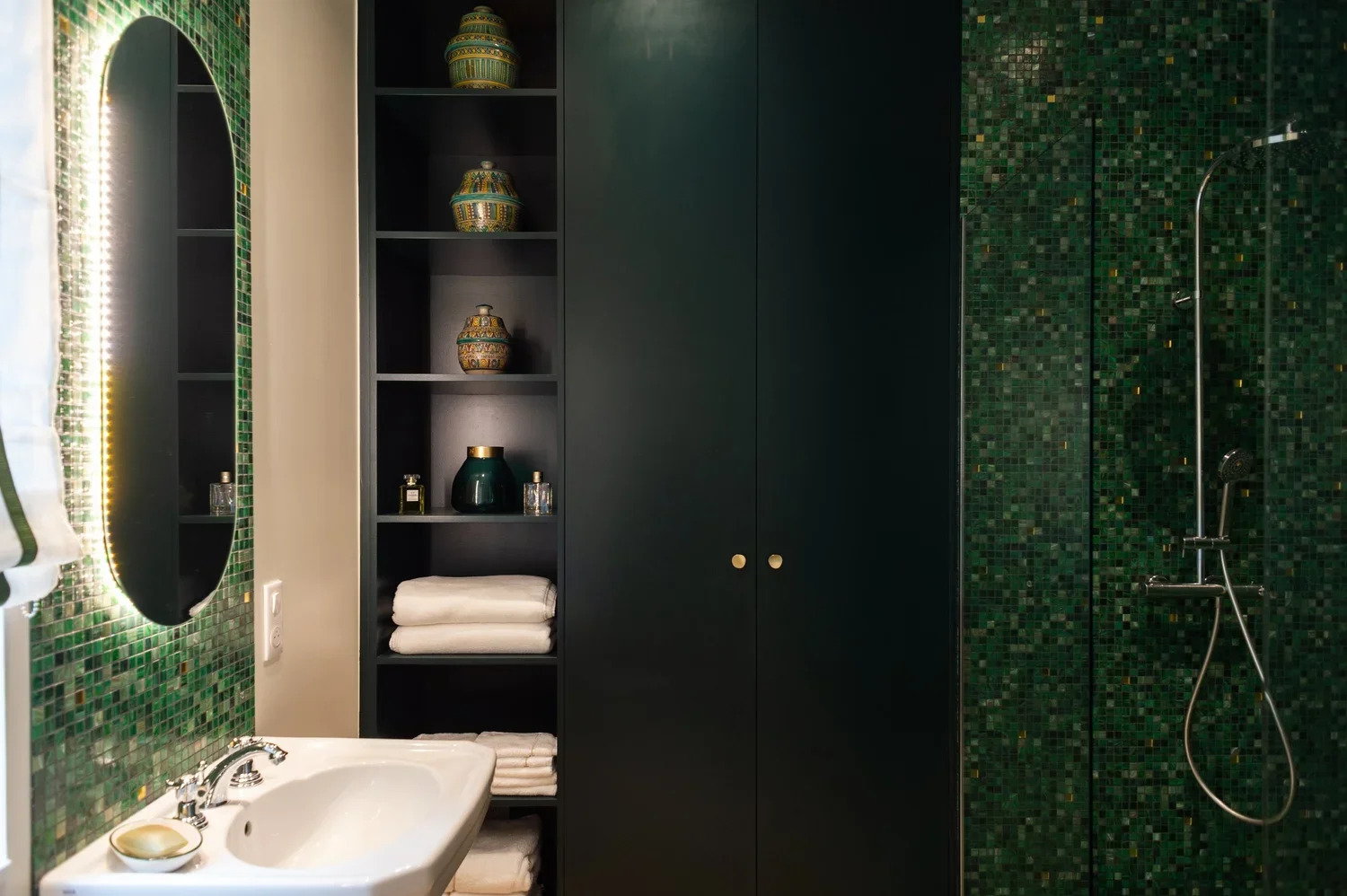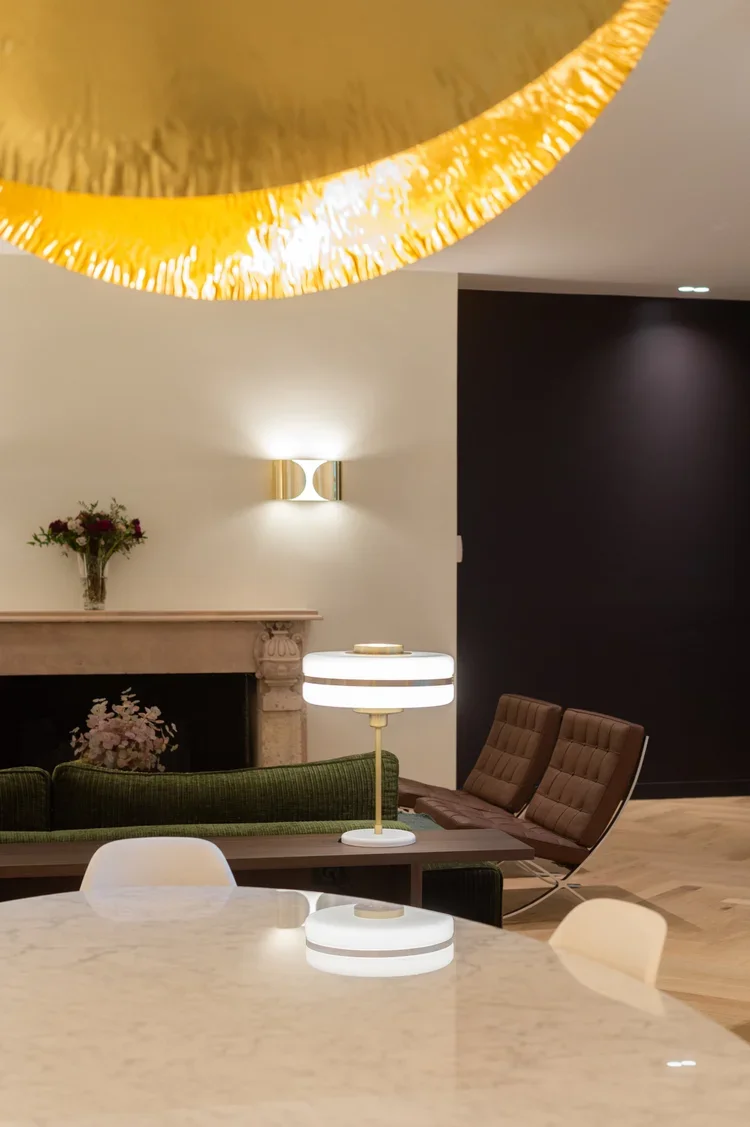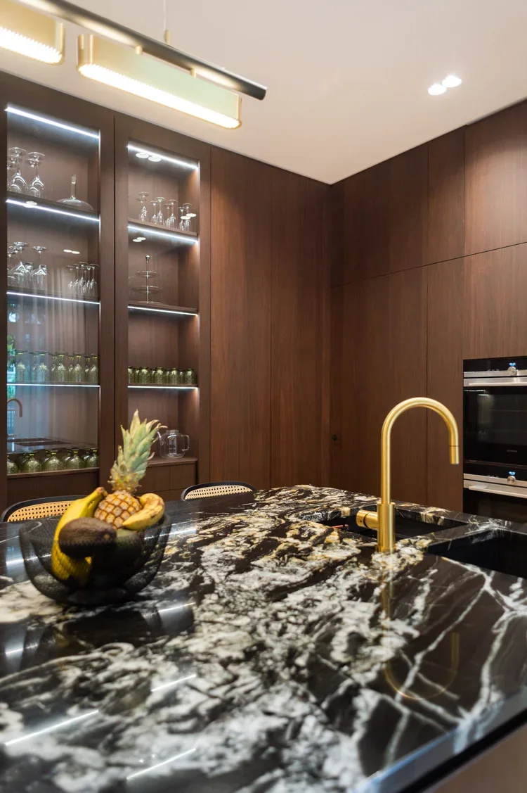 La pièce maitresse de cette chartreuse paisible de 215 m² située en plein cœur de Toulouse est évidemment la cuisine. La finition en noyer d’Amérique de chez Oberflex crée tout le caractère de cet espace. La cuisine sombre au granit veiné assume sa place dans ce lieu lumineux. Un seul et même espace, mais des zones délimitées : la cuisine, le salon et la salle à manger se succèdent sans souci. Les luminaires de chez Bert Frank viennent apporter de la brillance par le laiton et une touche de délicatesse. Quant à la suite parentale, elle a été pensée comme un cocon de douceur, entre la moquette au sol et les lumières indirectes. La salle de bain est conçue comme une enveloppe grâce aux murs de mosaïques Bisazza et à la peinture choisie dans un vert profond. Ce projet joue avec le clair/obscur et s’affranchi des difficultés que peuvent poser des choix de matériaux sombres.
