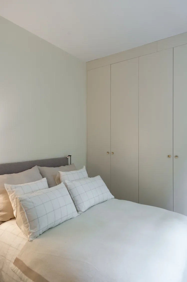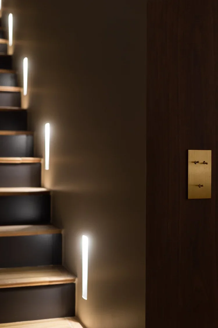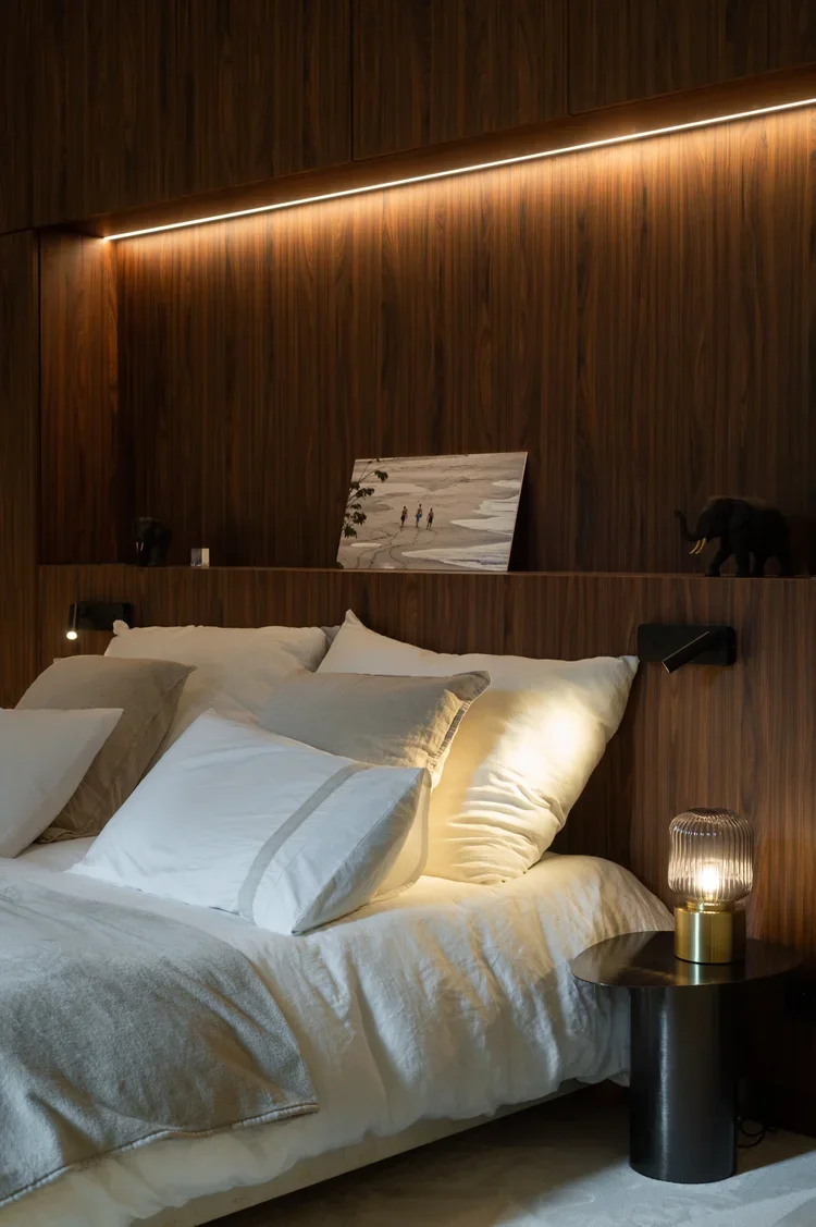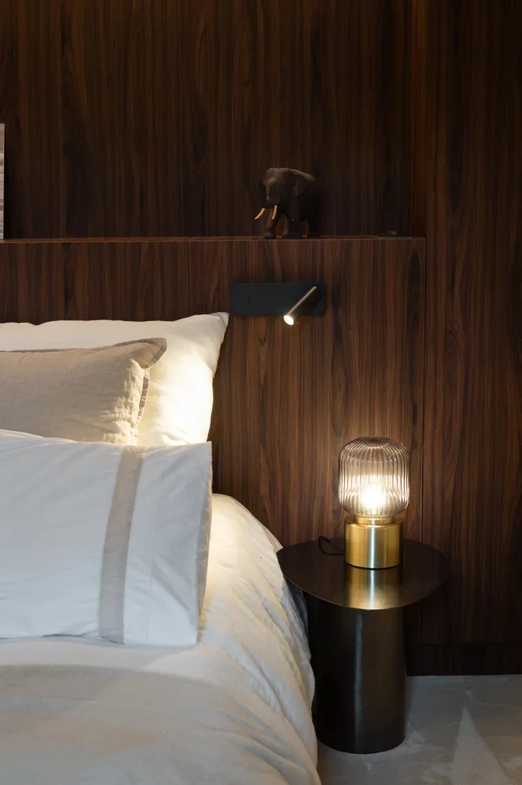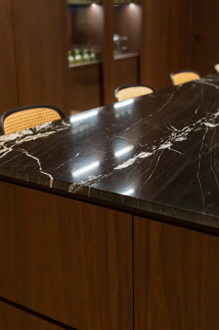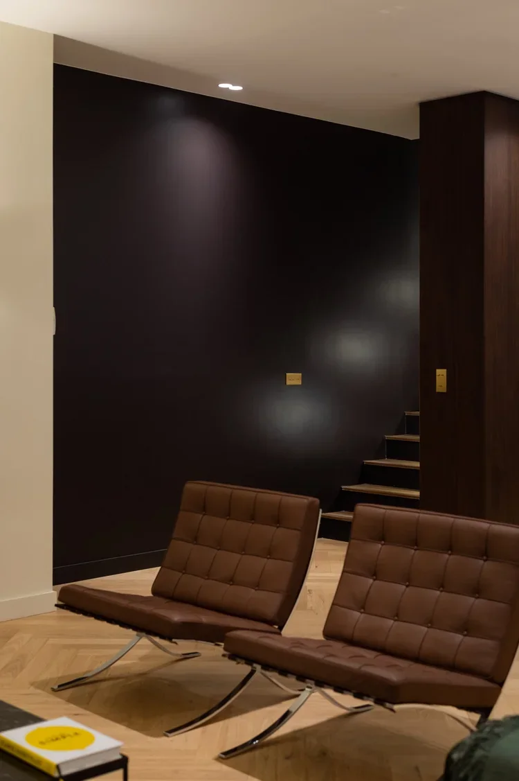 La pièce maitresse de cette chartreuse paisible de 215 m² située en plein cœur de Toulouse est évidemment la cuisine. La finition en noyer d’Amérique de chez Oberflex crée tout le caractère de cet espace. La cuisine sombre au granit veiné assume sa place dans ce lieu lumineux. Un seul et même espace, mais des zones délimitées : la cuisine, le salon et la salle à manger se succèdent sans souci. Les luminaires de chez Bert Frank viennent apporter de la brillance par le laiton et une touche de délicatesse. Quant à la suite parentale, elle a été pensée comme un cocon de douceur, entre la moquette au sol et les lumières indirectes. La salle de bain est conçue comme une enveloppe grâce aux murs de mosaïques Bisazza et à la peinture choisie dans un vert profond. Ce projet joue avec le clair/obscur et s’affranchi des difficultés que peuvent poser des choix de matériaux sombres.