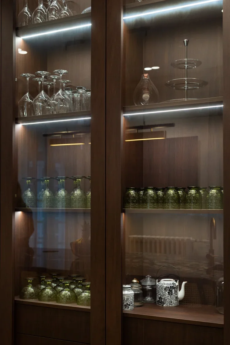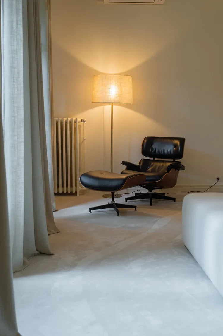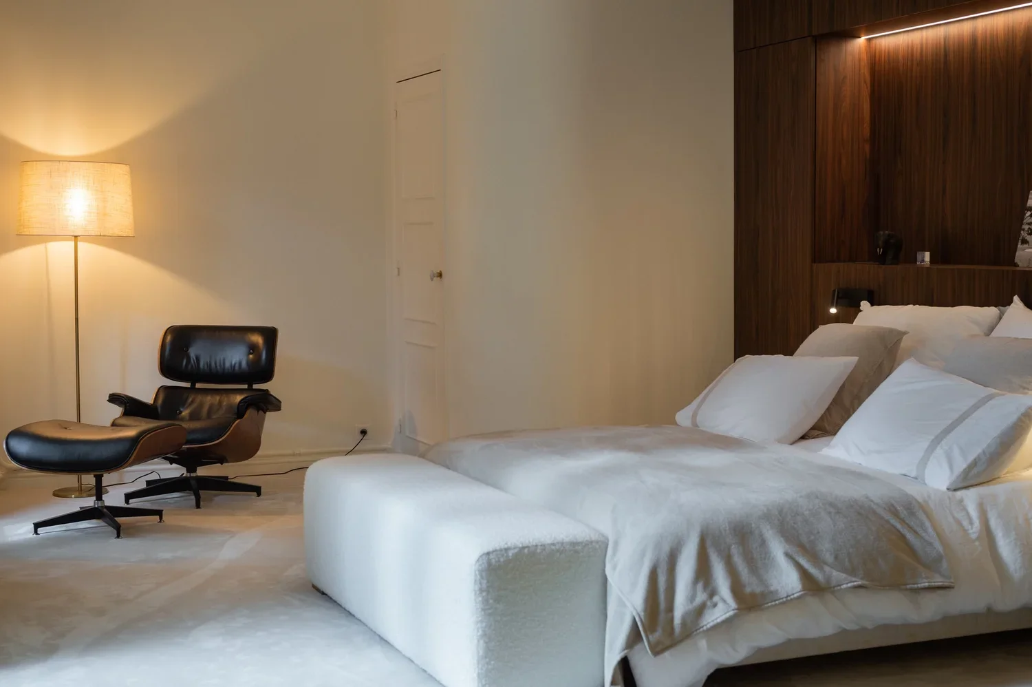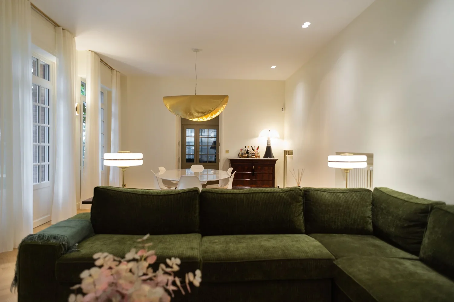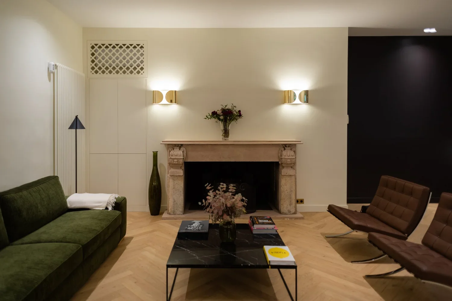 La pièce maitresse de cette chartreuse paisible de 215 m² située en plein cœur de Toulouse est évidemment la cuisine. La finition en noyer d’Amérique de chez Oberflex crée tout le caractère de cet espace. La cuisine sombre au granit veiné assume sa place dans ce lieu lumineux. Un seul et même espace, mais des zones délimitées : la cuisine, le salon et la salle à manger se succèdent sans souci. Les luminaires de chez Bert Frank viennent apporter de la brillance par le laiton et une touche de délicatesse. Quant à la suite parentale, elle a été pensée comme un cocon de douceur, entre la moquette au sol et les lumières indirectes. La salle de bain est conçue comme une enveloppe grâce aux murs de mosaïques Bisazza et à la peinture choisie dans un vert profond. Ce projet joue avec le clair/obscur et s’affranchi des difficultés que peuvent poser des choix de matériaux sombres.