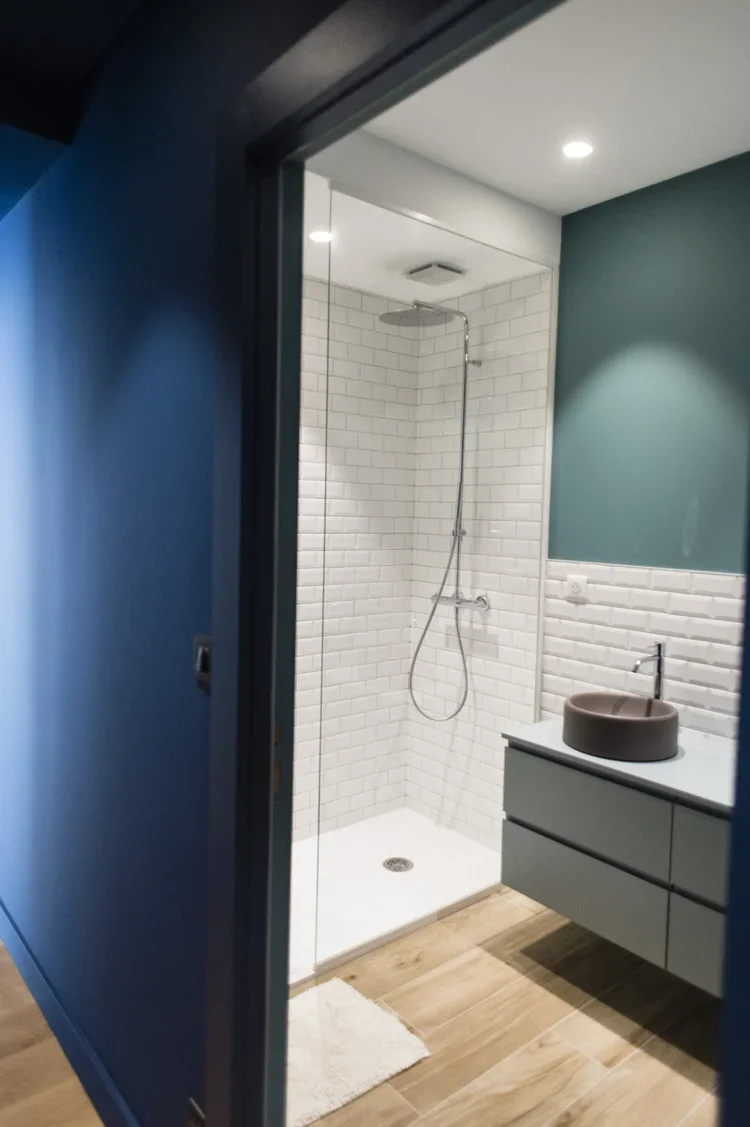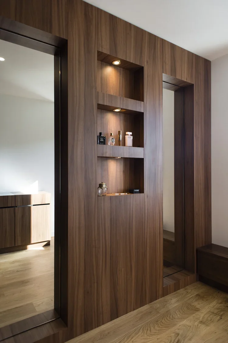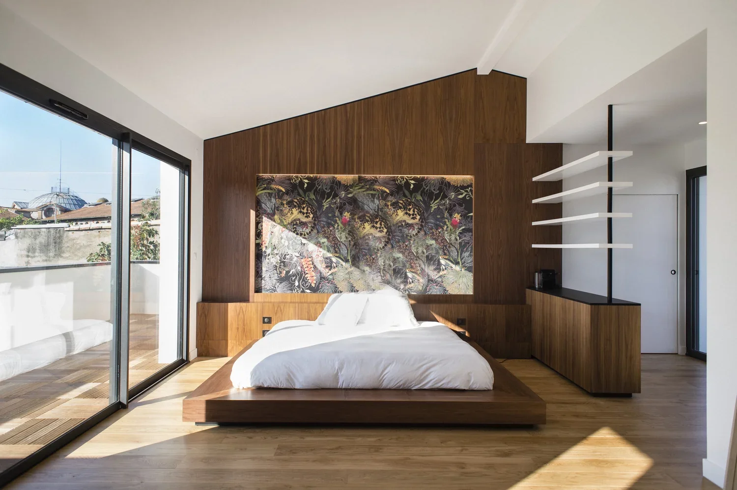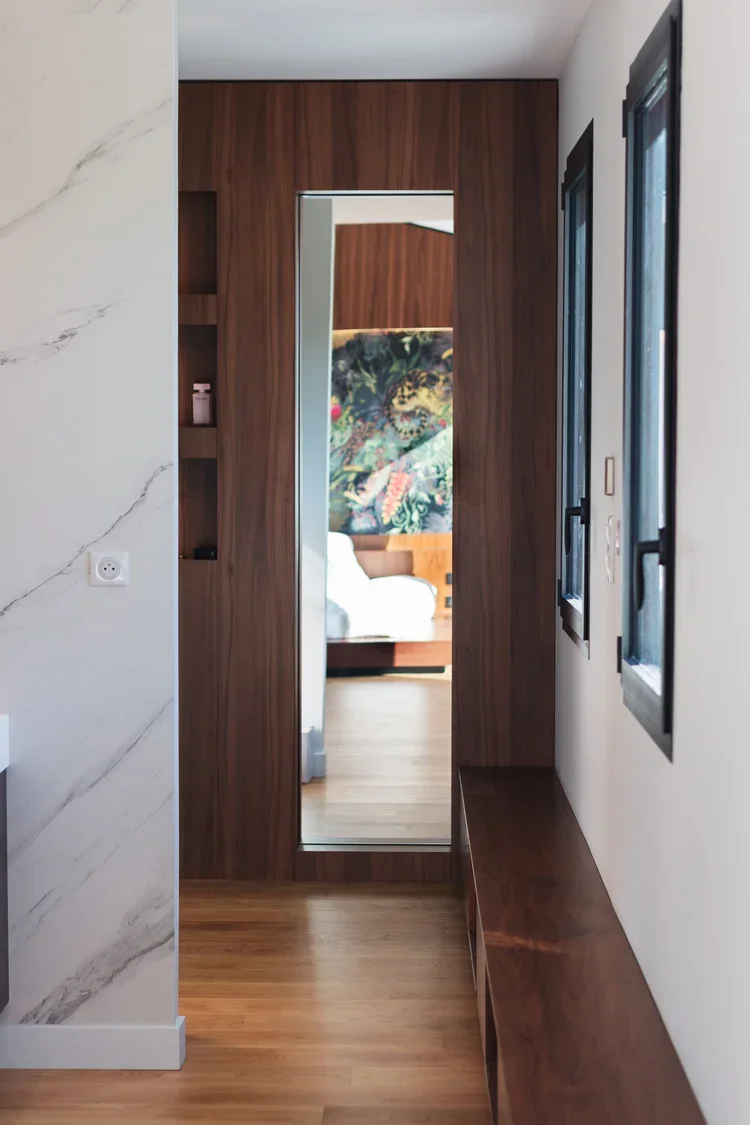 Dans la suite parentale, le souhait a été de ne pas cloisonner et fermer les espaces, chambre, salle de bain, dressing. Une harmonisation dans le choix des matériaux fait le lien entre les zones.