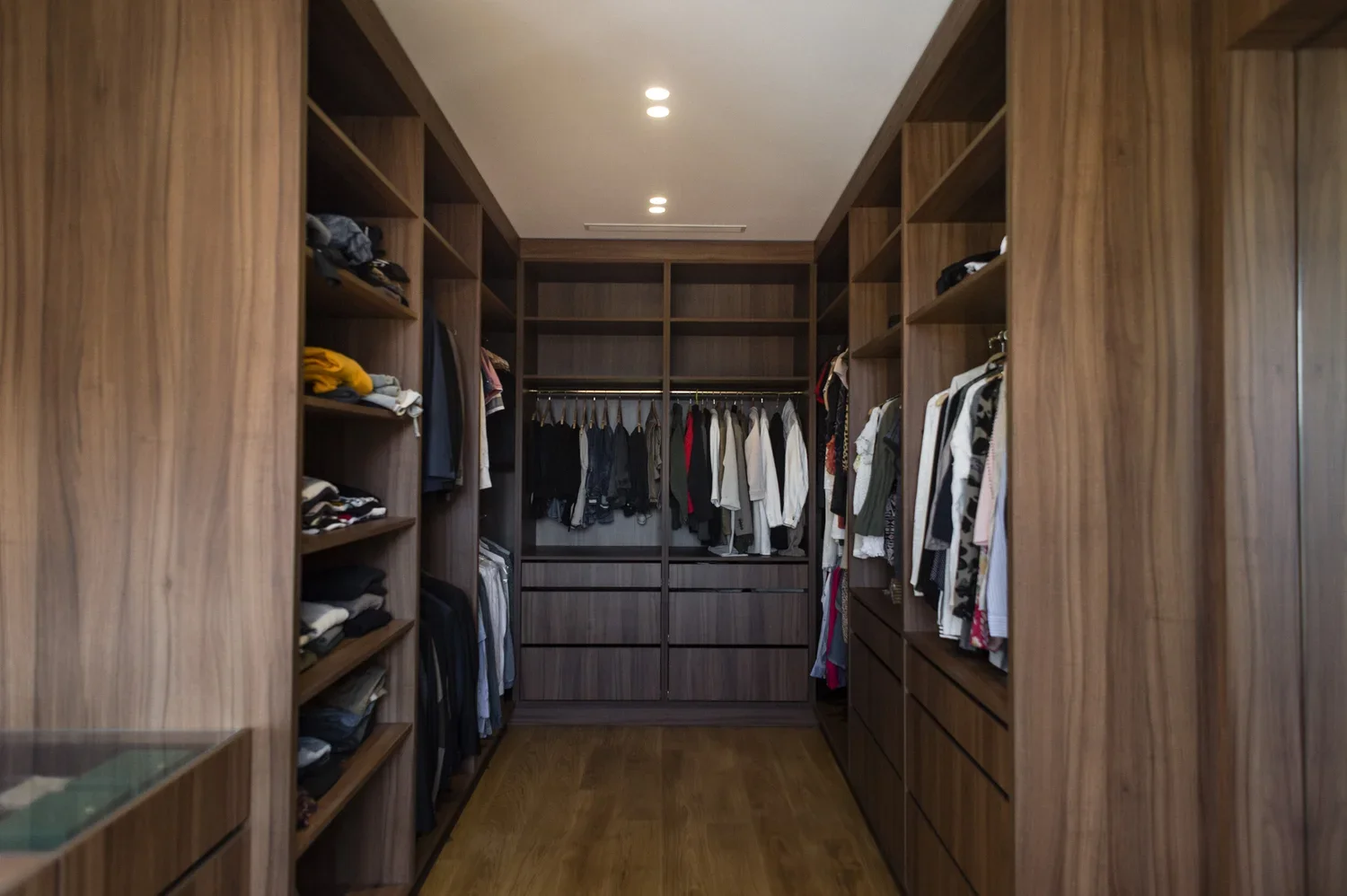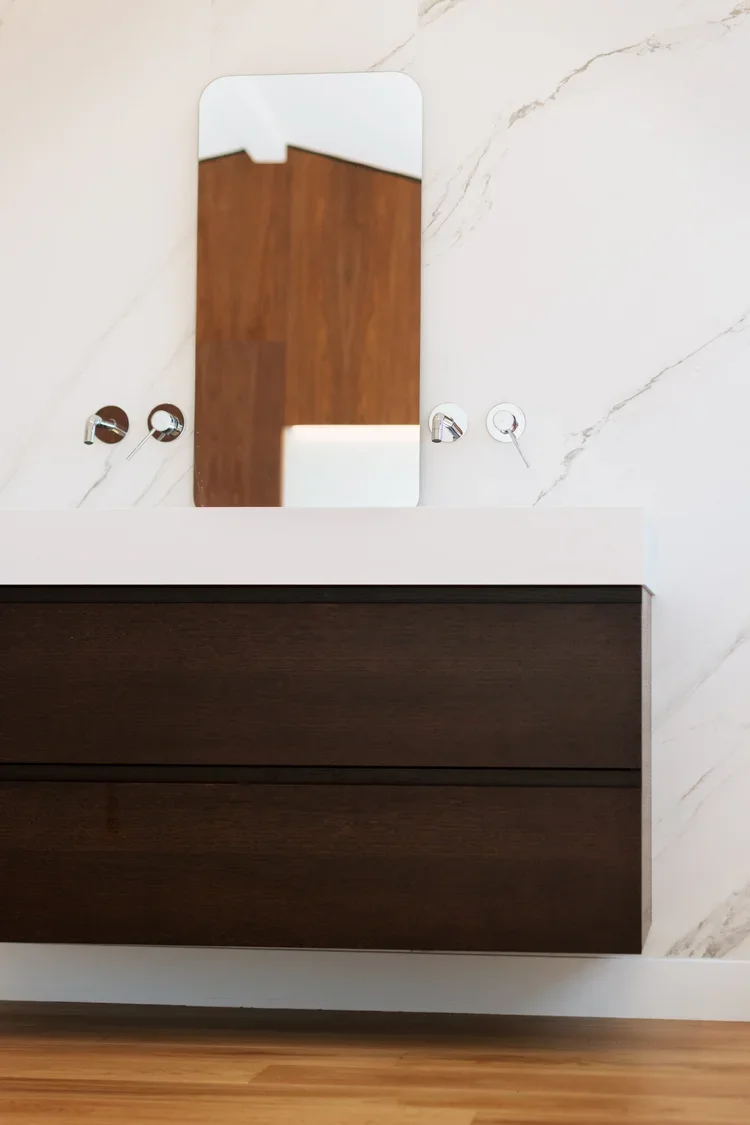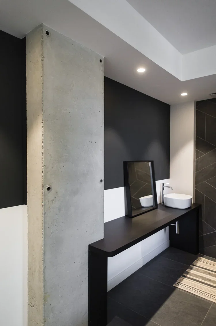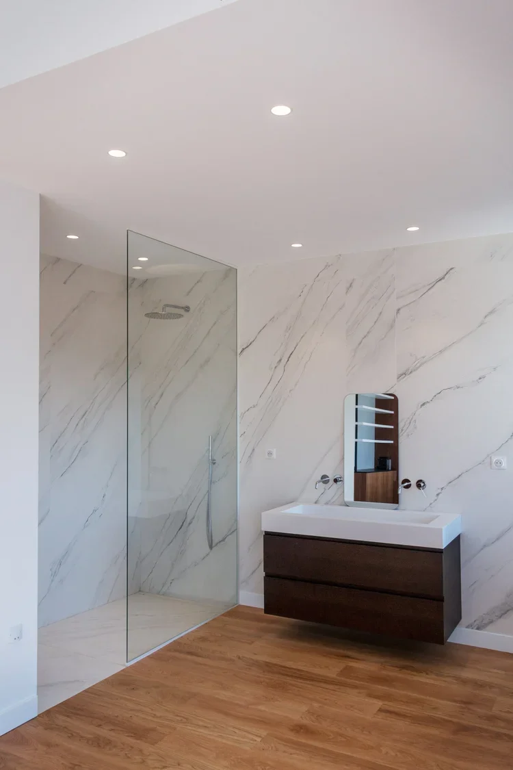 Dans la suite parentale, le souhait a été de ne pas cloisonner et fermer les espaces, chambre, salle de bain, dressing. Une harmonisation dans le choix des matériaux fait le lien entre les zones.