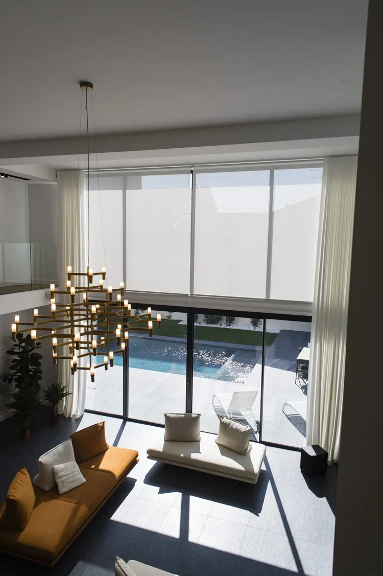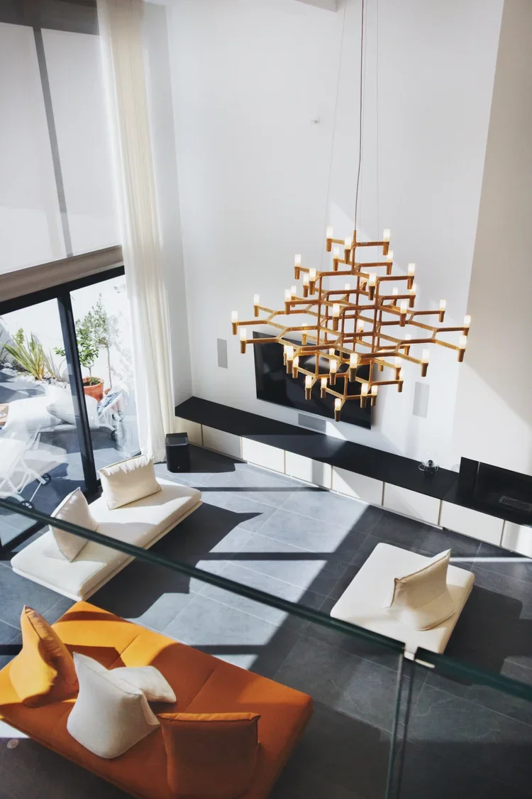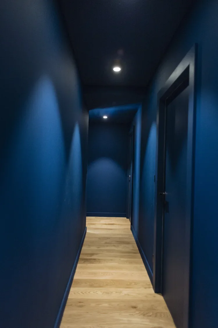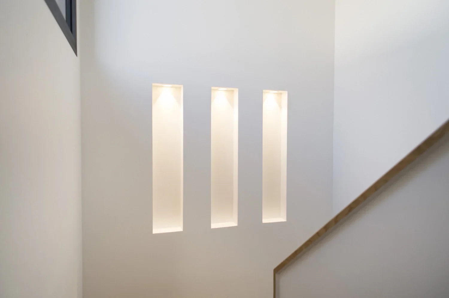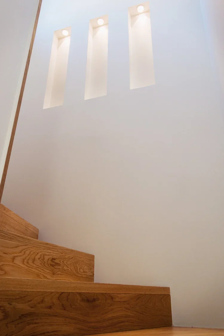 Les maitres d’œuvre ont souhaité un travail approfondi pour l’intérieur. Le choix du carrelage a été fait de manière à avoir une continuité entre intérieur et extérieur. Il a été posé sur sol chauffant au RDC. Pour les étages et les espaces de nuit, un parquet chêne a été choisi. Une cheminée au centre du séjour, assise sur une banquette ou socle, avec rangements en partie basse, crée une horizontalité en contraste avec le conduit de cheminée occupant toute la hauteur sur deux niveaux.