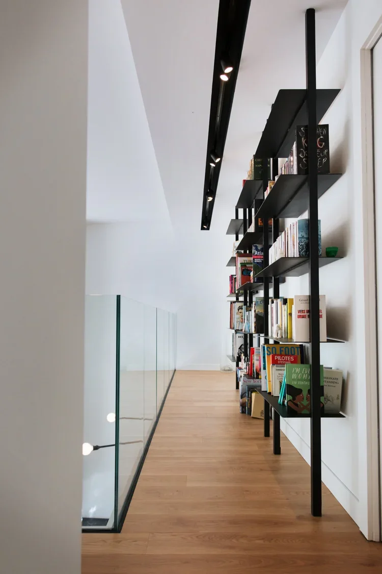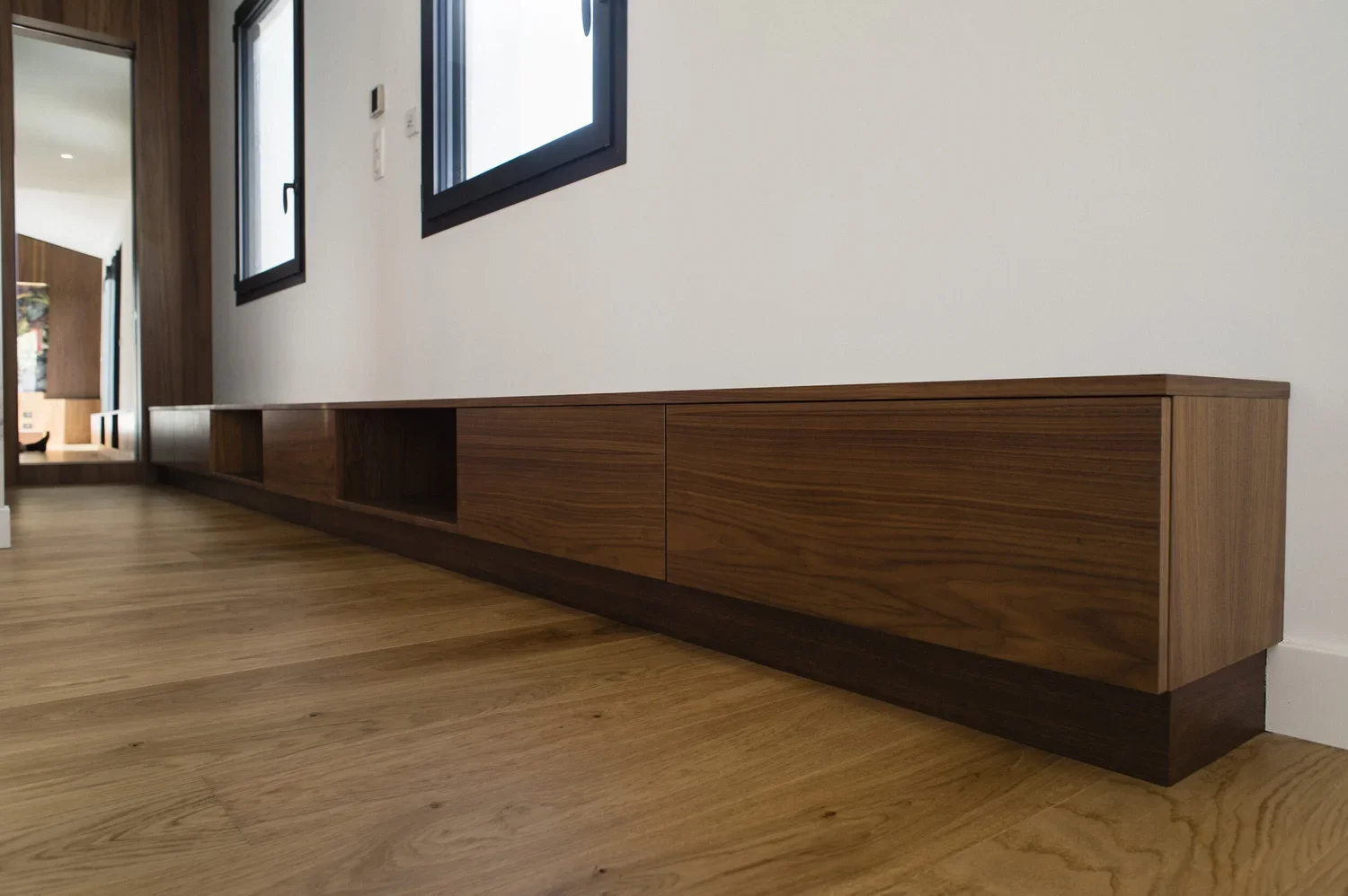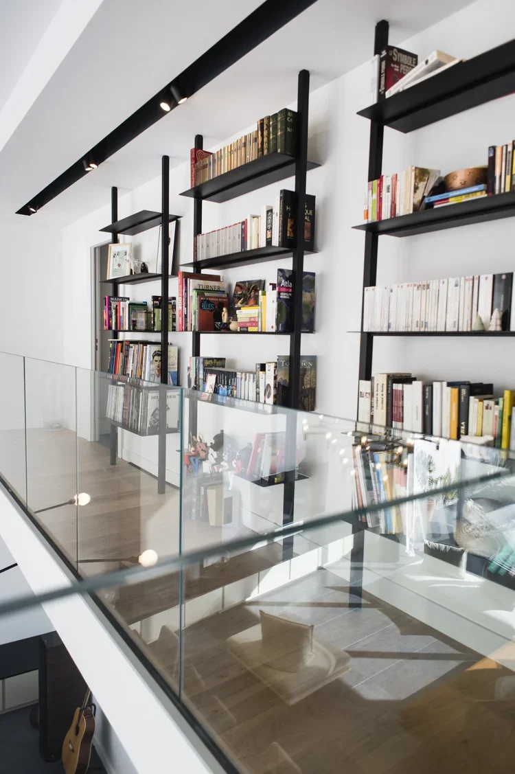 Tout a été dessiné et réalisé sur mesure en chêne, noyer, laque, marbre noir et blanc et certaines pièces comme la bibliothèque en acier teinté noir.