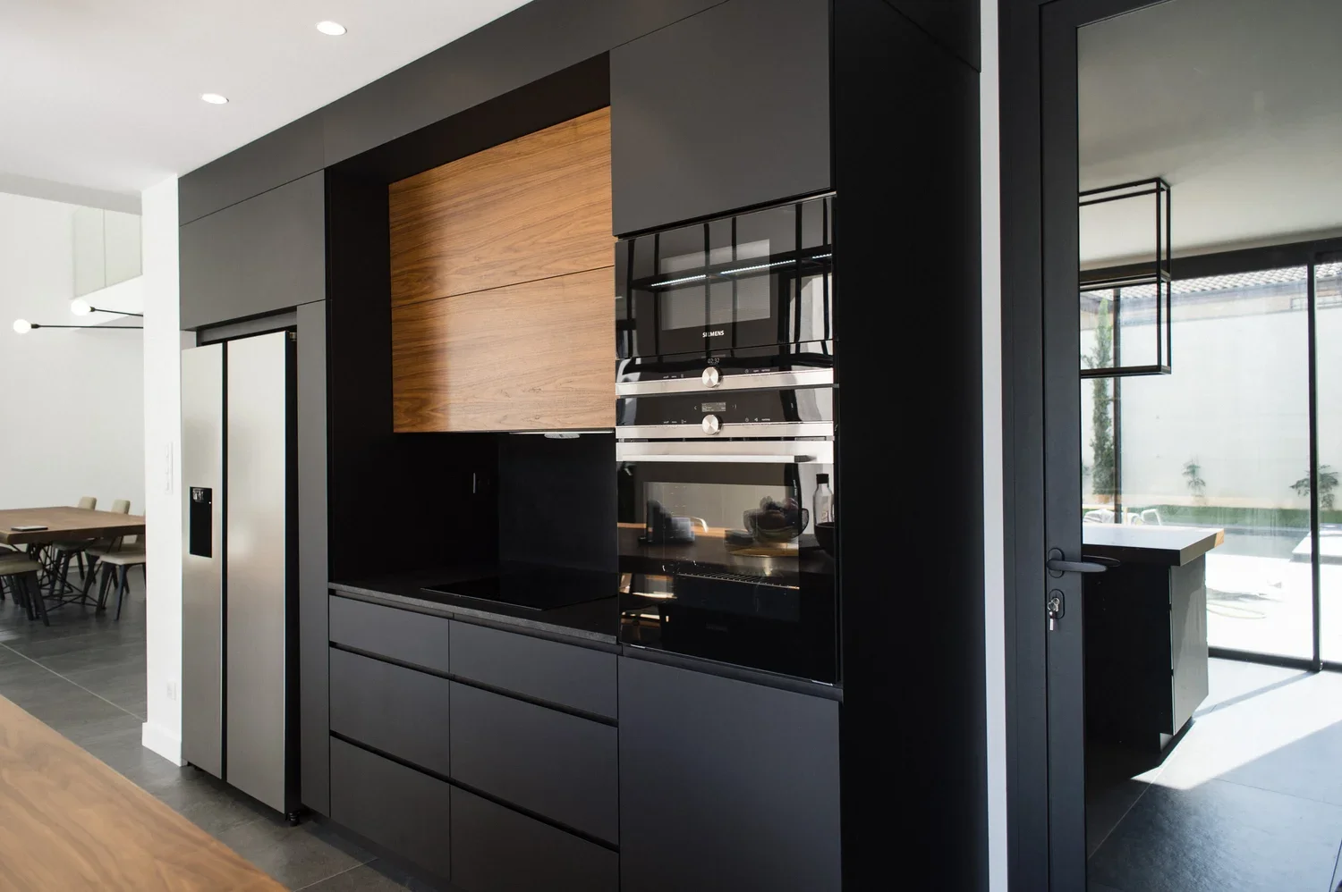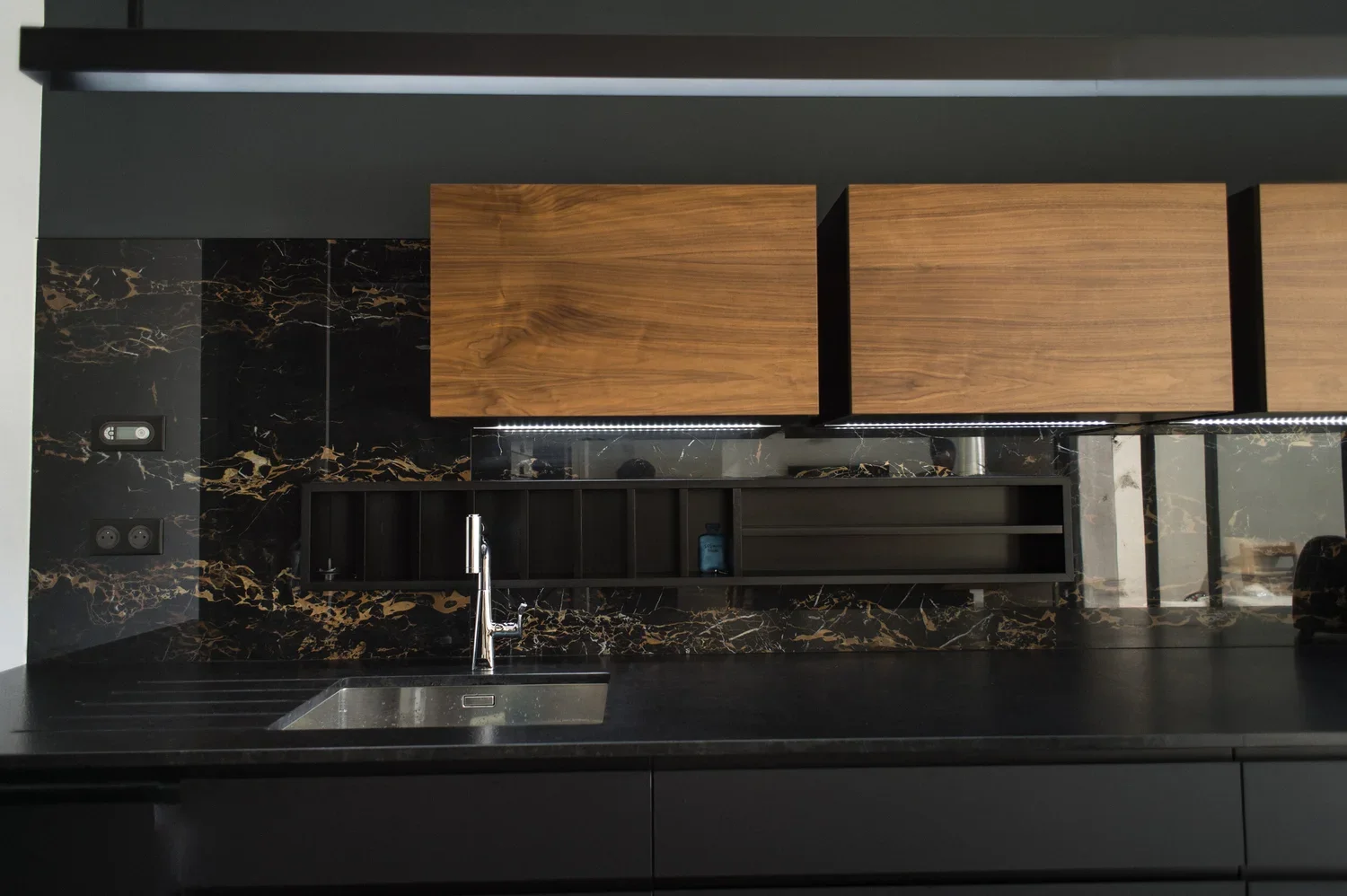 Pour la cuisine faisant partie intégrante du salon, le choix a été d’utiliser des matériaux nobles et sobres afin de donner plus un aspect sophistiqué que de laboratoire.