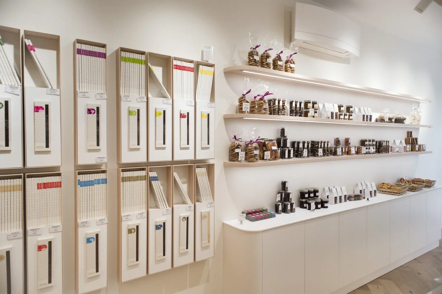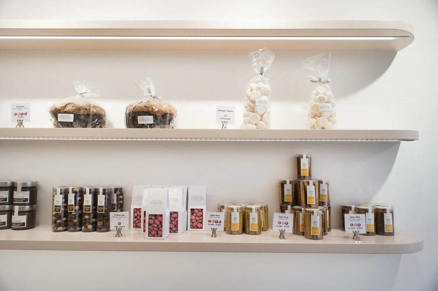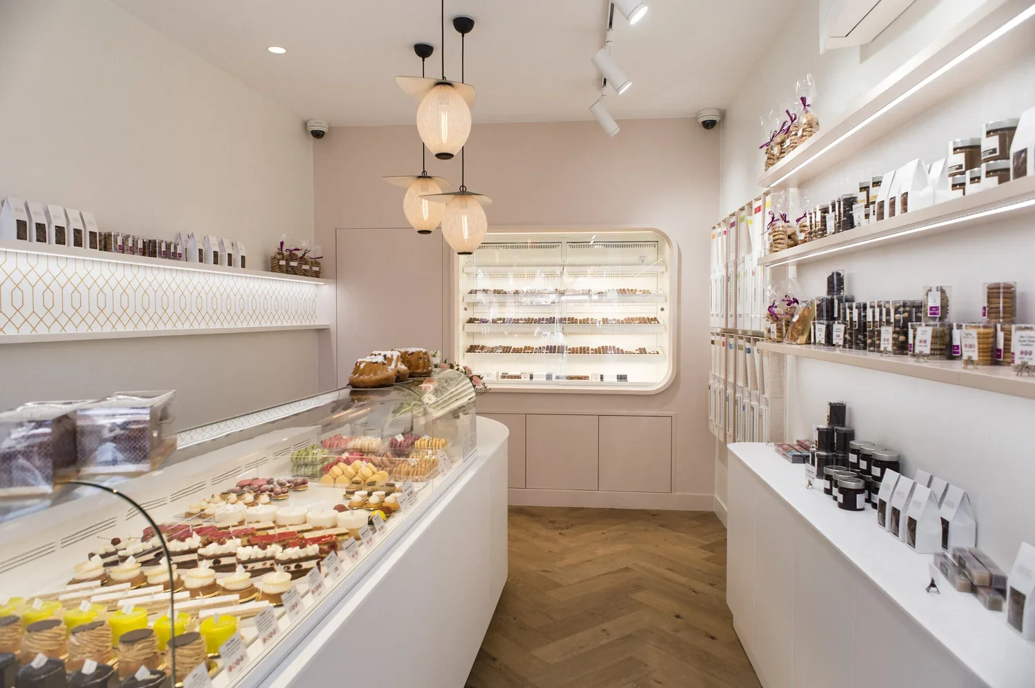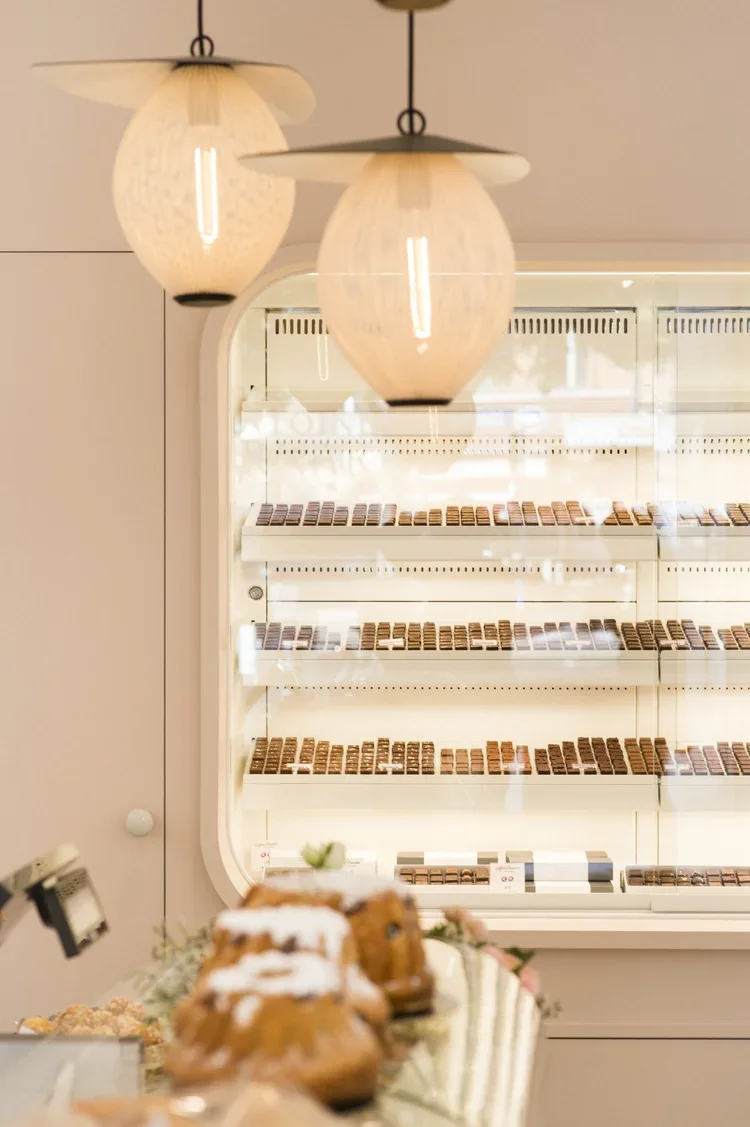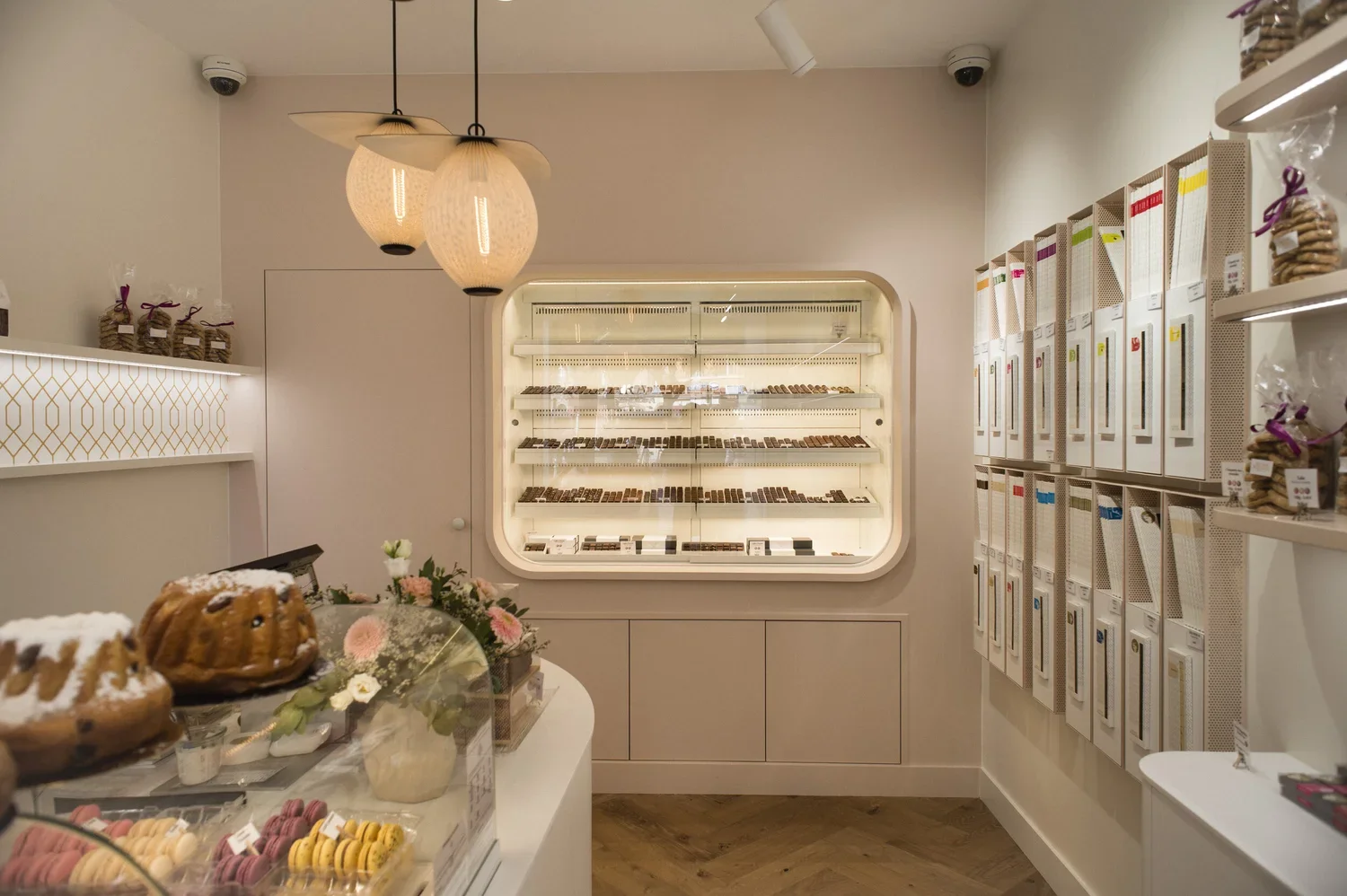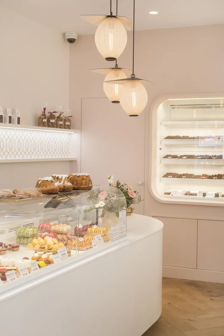 La charte graphique a des redondances par rapport à la première réalisation tout en rajoutant une nouvelle touche avec un peu de rose pâle qui donne un aspect de boudoir et de douceur dans ce petit écrin de 35 m². L’atelier de stockage et de préparation est à l’arrière de la boutique, restant discret.