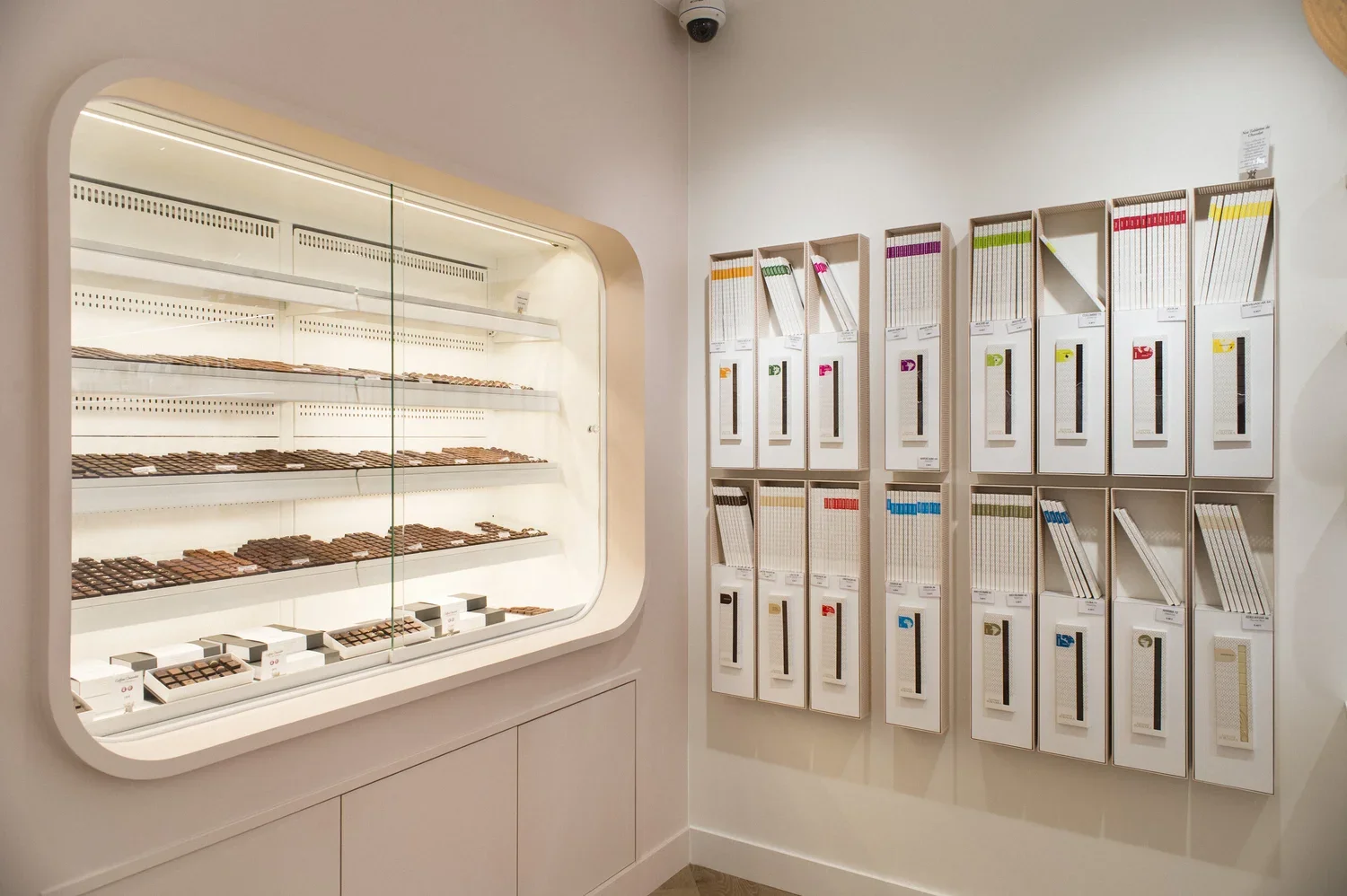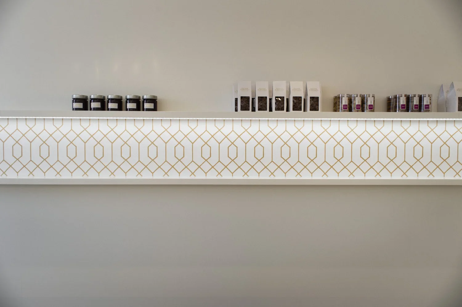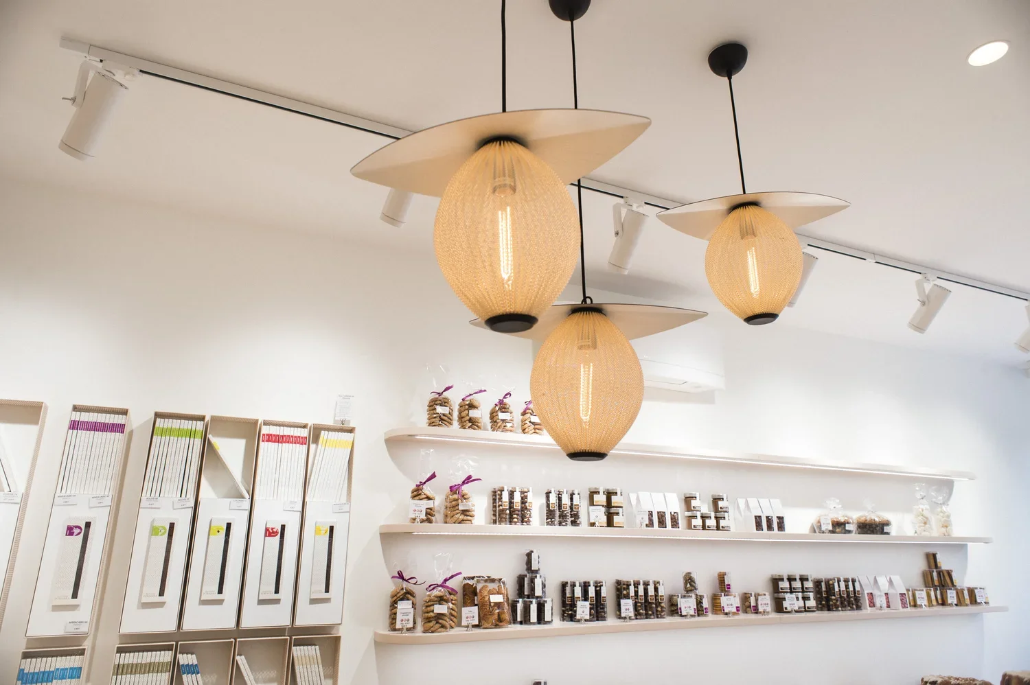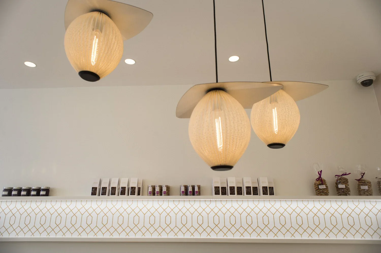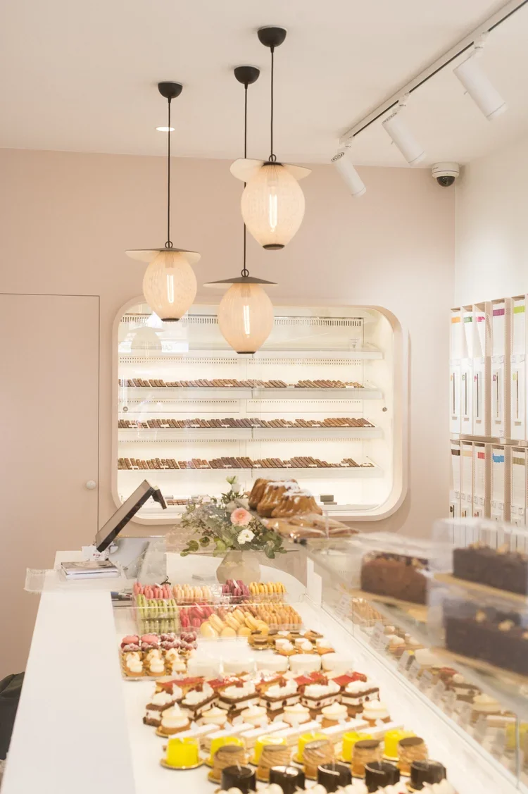 La charte graphique a des redondances par rapport à la première réalisation tout en rajoutant une nouvelle touche avec un peu de rose pâle qui donne un aspect de boudoir et de douceur dans ce petit écrin de 35 m². L’atelier de stockage et de préparation est à l’arrière de la boutique, restant discret.